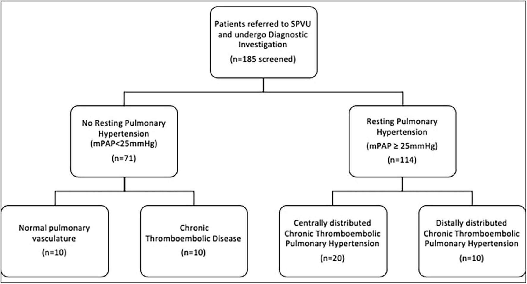 Consecutive patients with complete data sets were included in the analysis (Figure 1). Over that period, 71 patients underwent detailed investigation and had no evidence of pulmonary hypertension at rest. Of these, 23 were diagnosed with CTED, 10 of whom had complete data sets of radiological and physiological investigations, including CPET. The main limiting factor was access to CPET data as this relies on a good degree of exercise capacity to generate meaningful results. Those with distal CTEPH were functionally limited, so CPET data was often not available for these patients. The remaining 48 patients had normal pulmonary vasculature, 10 of whom had complete data sets of radiological and physiological investigations. One hundred fourteen patients underwent investigations for, and were diagnosed with, CTEPH, thirty of whom were included in analysis due to data availability. Twenty of these patients were seen to have central disease, defined as the presence of thrombus in the segmental pulmonary arteries. Ten had distal disease, which was non-operable.