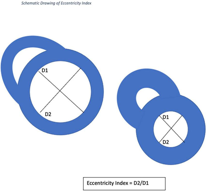 D1 is the endocardial measurement perpendicular to the interventricular septum at the largest diameter. D2 is the endocardial measurement at the largest length. D2/D1 is used to calculate eccentricity index in end-diastole and end-systole. These can be difficult to define in pulmonary hypertension, so, using the QRD complex to identify systole, images were identified around the end of systole and the end diastole. These were analyzed and those with the smallest LV volume were classed as end-systole and those with the largest were classed as end-diastole.