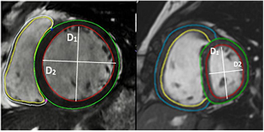 Figure 3. Image of short axis CMR demonstrating the volumetric analysis and the calculation of eccentricity index using CMR images.