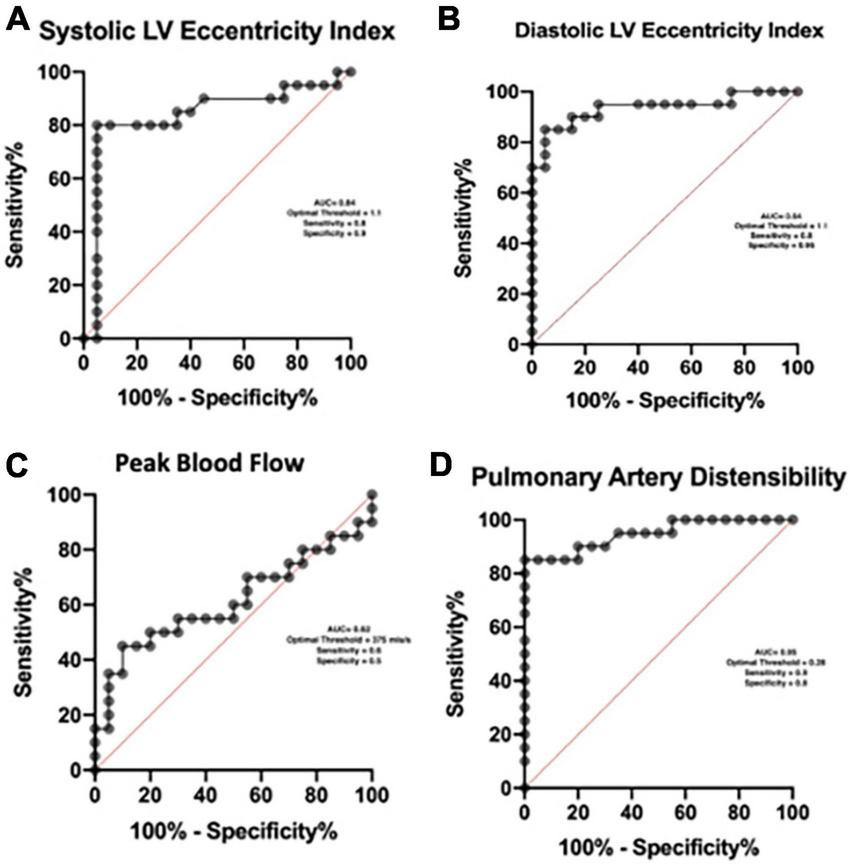 Using Receiver operator curves the optimal threshold for the detection of pulmonary hypertension with the systolic EI is 1.1 (AUC = 0.84), diastolic index is 1.1 (AUC = 0.94) and pulmonary artery distensibility is 0.28 (AUC = 0.95). We found no meaningful threshold for the peak blood flow (Figure 4).