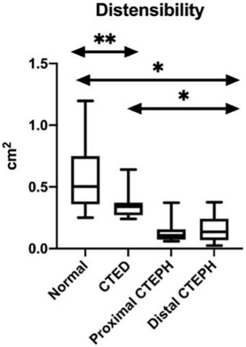 • Both EI and pulmonary artery distensibility could discriminate between the normal, CTED and CTEPH population.
