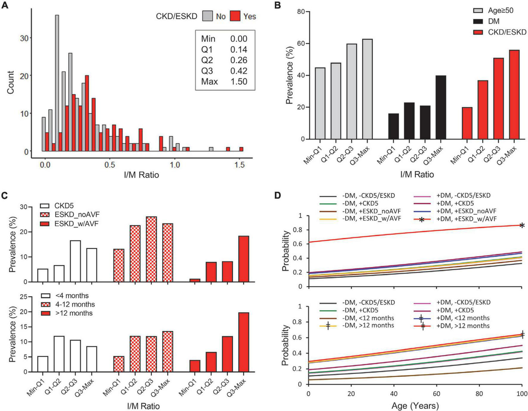 Predictors of high intimal hyperplasia (IH) in CKD and non-CKD veins. (A) Histogram of IH expressed as intima/media area ratio in CKD/ESKD and non-CKD veins. The minimum, first quartile (Q1), median (Q2), third quartile (Q3), and maximum values are indicated for the overall study cohort. (B) Prevalence of age ≥ 50 years, diabetes, and CKD/ESKD per quartile of IH in the overall study cohort. (C) Distribution of CKD and ESKD subgroups per quartile of IH according to disease stage and vascular access history (Top) or dialysis vintage (Bottom). (D) Probability of IH falling in the upper quartile values (≥0.42) as predicted by age and combined status of diabetes and CKD/ESKD stages. CKD subgroups are separated according to disease stage and vascular access history (Top) or dialysis vintage (Bottom). DM, diabetes; CKD5, stage 5 CKD; ESKD_noAVF, ESKD without previous AVF or AVG; ESKD_w/AVF, ESKD and previous AVF/AVG history. *p < 0.05 vs. all individual models, ‡p < 0.05 vs. (–) DM/(–)CKD5/ESKD and (–) DM/ < 12 months.