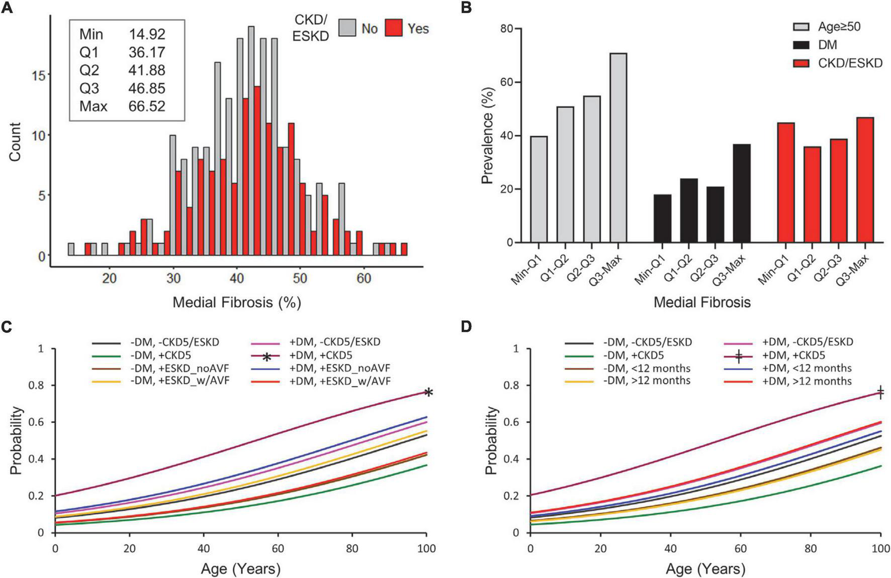 Statistical analyses were performed using XLSTAT 2020.1.1 (Addinsoft Inc., New York, NY) and GraphPad Prism 8.4.0 (San Diego, CA). Normally distributed data were expressed as mean ± standard deviation (SD) and compared using the Student’s t-test. When normality criteria were not met, data were expressed as median and interquartile range (IQR) and compared using the Mann-Whitney test or Kruskal-Wallis tests with post hoc comparisons. Categorical values were compared using the Fisher’s exact test. Associations between binary clinical covariates (positive or negative diagnosis of CKD/ESKD, diabetes, and hypertension) and continuous morphometry data (intima/media area ratio, and medial fibrosis) were evaluated using multivariate general linear regression models adjusted for age, sex, ethnicity/race, comorbidities, and type of vein. In addition, we evaluated associations between clinical covariates and upper quartile morphometry values (Q3-maximum). Continuous data were converted to binary status (1 if ≥ Q3, 0 if < Q3) based on the upper quartile values of the overall study population and analyzed using multivariate logistic regression models adjusted for the above characteristics. To examine the additive effects of CKD/ESKD and diabetes on upper quartile morphometry status, we used logistic regression models controlling for age. Results were considered significant when p < 0.05.