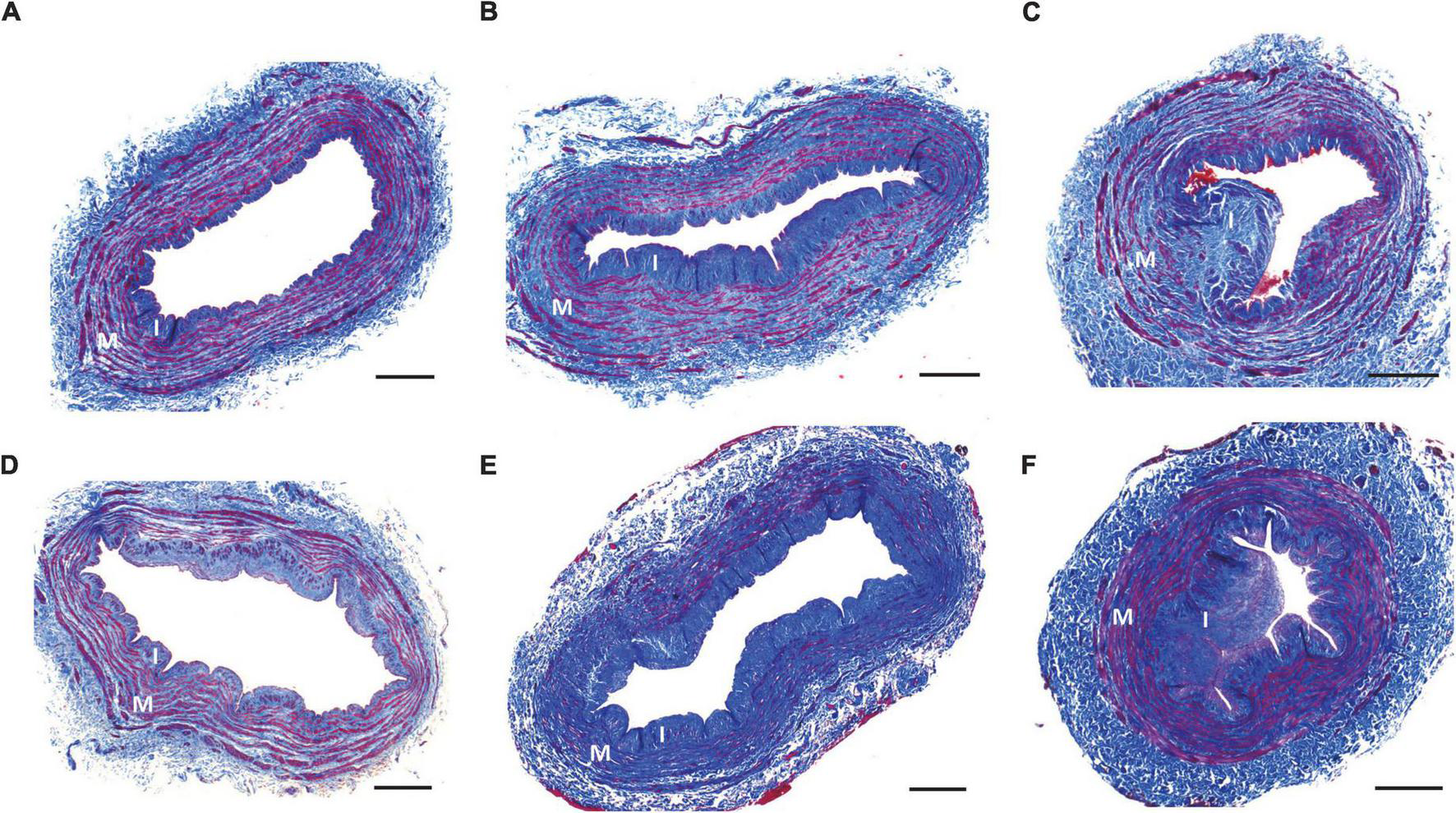 Intimal hyperplasia (IH) and imbalanced extracellular matrix (ECM) remodeling are implicated in the origin and progression of vascular diseases, and in postoperative complications after vascular surgeries (2, 5–10). Concentric development of IH and moderate degree of wall fibrosis are frequently found in veins of CKD patients at the time of hemodialysis access creation (8, 11, 12). Despite mild or no associations of pre-access vein morphometry with arteriovenous fistula (AVF) or graft (AVG) outcomes (8, 11, 13, 14), IH and excessive fibrosis may negatively influence the selection of vessels for vascular access surgeries (15).