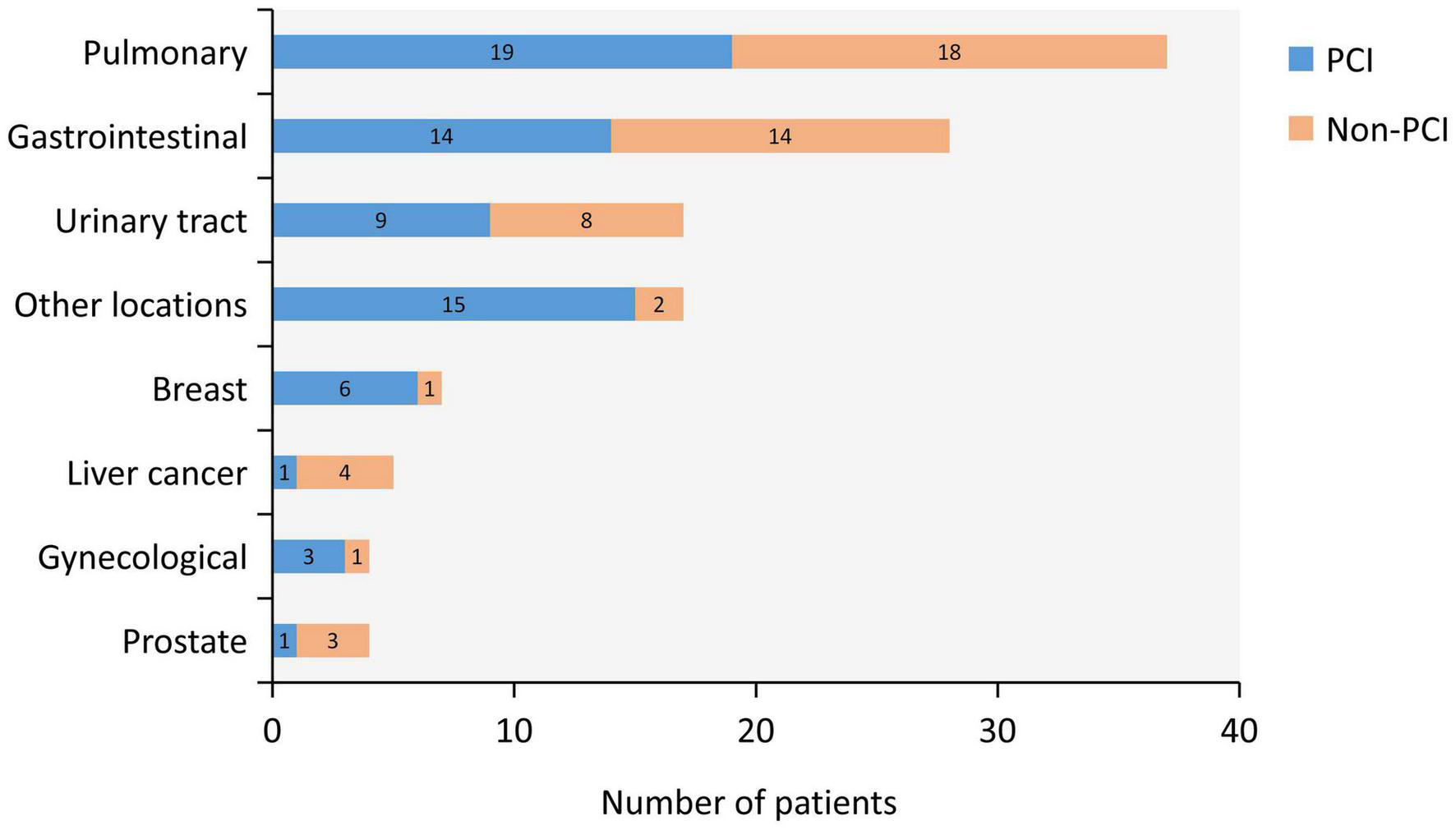 Type of Cancer. Type of cancer and distribution between percutaneous coronary intervention (PCI) group (blue) and non-PCI group (orange) are shown. Most common cancer types were pulmonary, gastrointestinal, urinary tract, and other locations.