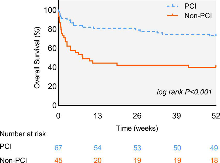 According to the clinical characteristics (Table 1), patients undergoing PCI had a higher mean BMI (23.26 vs. 22.11, p < 0.001) and lower mean CCI score (5.13 vs. 7.92, p < 0.001), age, sex and comorbidities, including hypertension, diabetes, dyslipidemia, and smoking, were similar between the two groups (all p > 0.05) (Table 1). No significant differences were observed in types of AMI, frequency of Killip class ≥2, serum troponin T, creatine kinase, and creatine kinase-MB levels (all p > 0.05). Recent cancer diagnosis within 1-year (64.7 vs. 23.5%, p < 0.001) or cancer with metastasis (29.4 vs. 10.3%, p = 0.008) were more common in the non-PCI group. More patients received chemotherapy in the non-PCI group than in the PCI group (29.4 vs. 11.8%, p = 0.016), with comparable rates of those receiving radiotherapy.