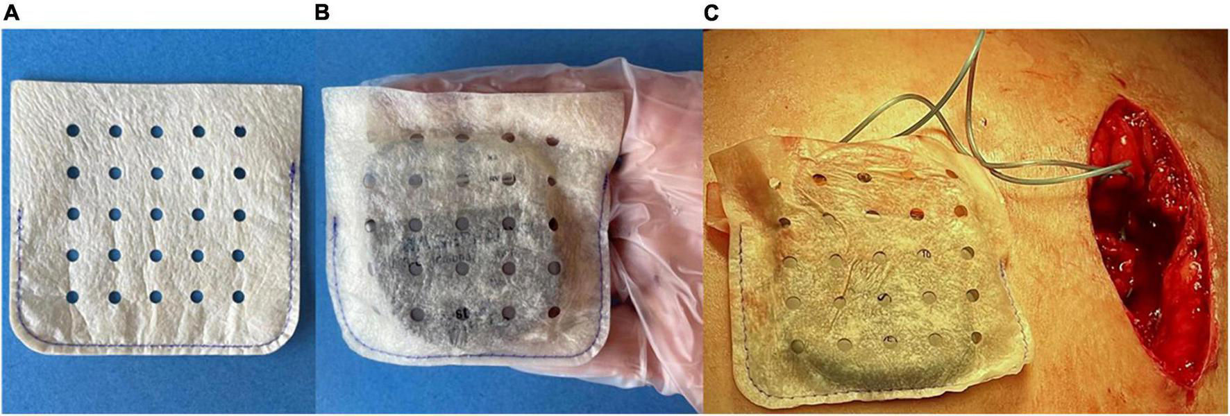 (A) A medium-size biologic CanGaroo® Envelope made from 4-ply lyophilized, decellularized, non-crosslinked extracellular matrix derived from porcine intestinal submucosa (SIS ECM). (B) Once hydrated by the implanting physician per manufacturer instructions, the biologic envelope handles well and conforms to the device. (C) Intraoperative photo of the hydrated biologic envelope just prior to being placed within the tissue pocket.