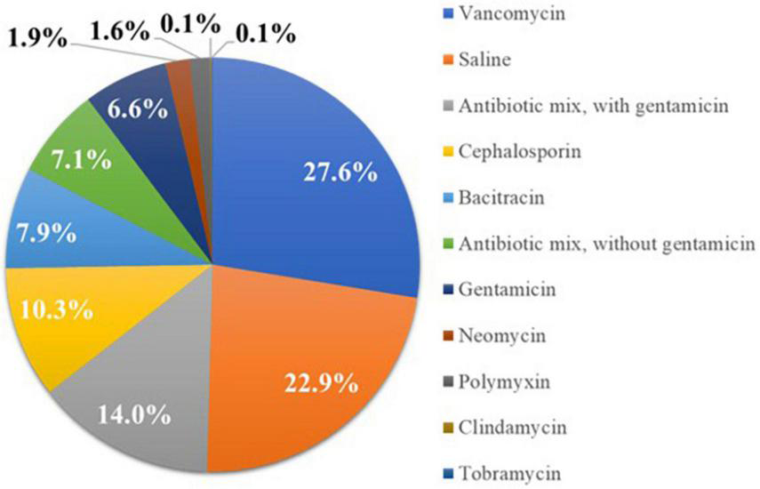 A total of 1,102 patients (n = 94 CARE, n = 1,008 SECURE) at 40 centers (n = 1: CARE, n = 39: SECURE), who received a CIED device implantation using a biologic ECM envelope hydrated in a known solution, were included in the analysis. Nine patients were excluded because the hydration solution used in these cases was unknown. The mean duration of follow-up for the overall sample was 223.7 ± 173.0 days. A total of 252 patients (22.9%) received biologic envelopes hydrated in Saline, 73 (6.6%) Gent Only, 227 (20.6%) Any ABX + Gent, and 623 (56.5%) Any ABX − Gent. The specific antibiotics selected by implanting physicians in the study are illustrated in Figure 2.
