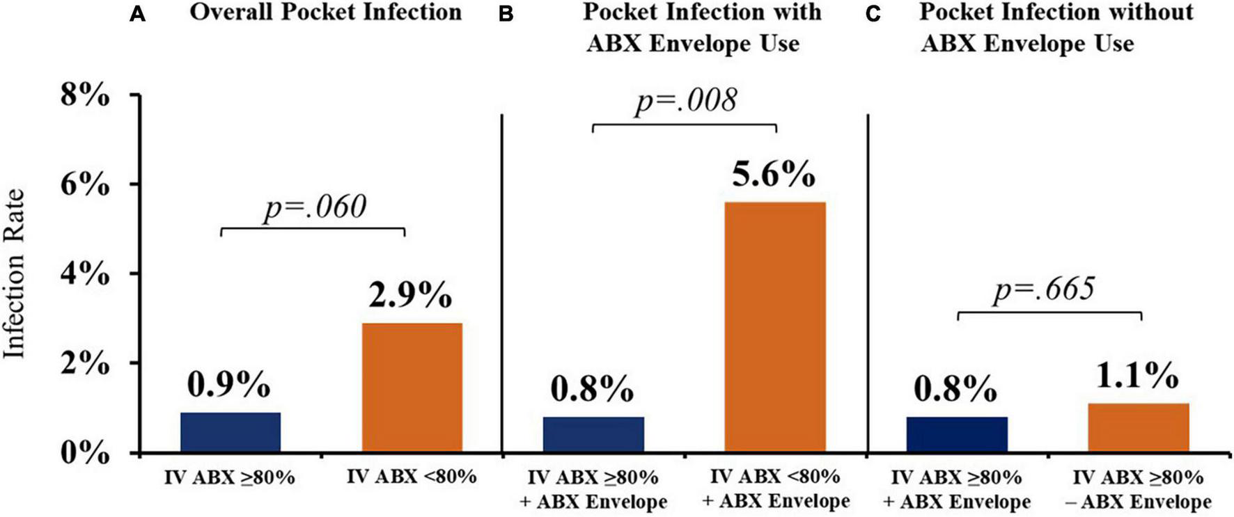 Based on these clinical and economic concerns, infection prevention is a key consideration associated with the implantation of cardiac devices. Evidence-based prophylactic approaches include the utilization of guideline-directed preoperative intravenous antibacterial prophylaxis (IV ABX), the use of strict skin antisepsis, and potentially the employment of antibacterial CIED envelopes (1, 17–19). In the large Prevention of Arrhythmia Device Infection Trial (PADIT), there was no difference in the CIED infection rate between patients receiving a conventional perioperative antibiotic regimen vs. those undergoing an incremental antibiotic approach (19). The 0.9% hospitalization-for-infection rate in the overall population and 1.11% rate in the high-risk group establish standards for best-in-class infection rates, especially given the large and geographically diverse enrollment (19,603 patients from 28 centers) (19).