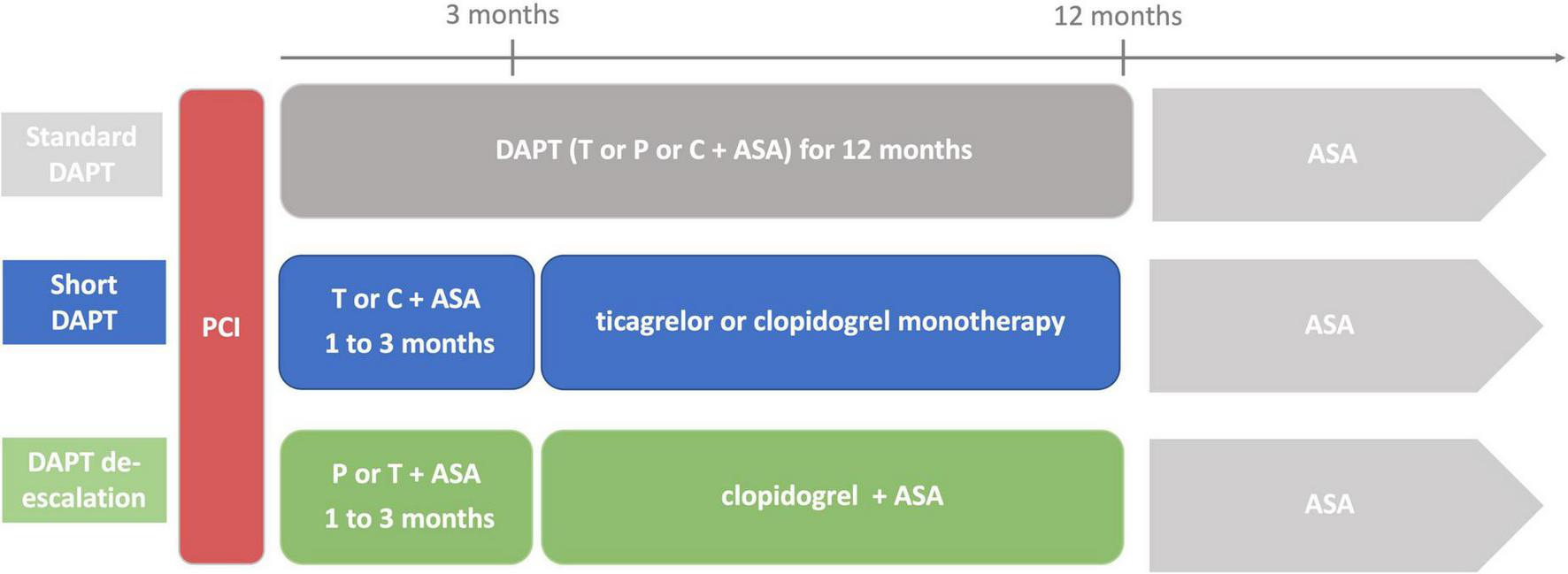 Antithrombotic strategies of Standard DAPT, Short DAPT and DAPT De-escalation. DAPT: dual antiplatelet therapy, T: Ticagrelor, P: Prasugrel, C: Clopidogrel, ASA: Acetylsalicylic Acid.