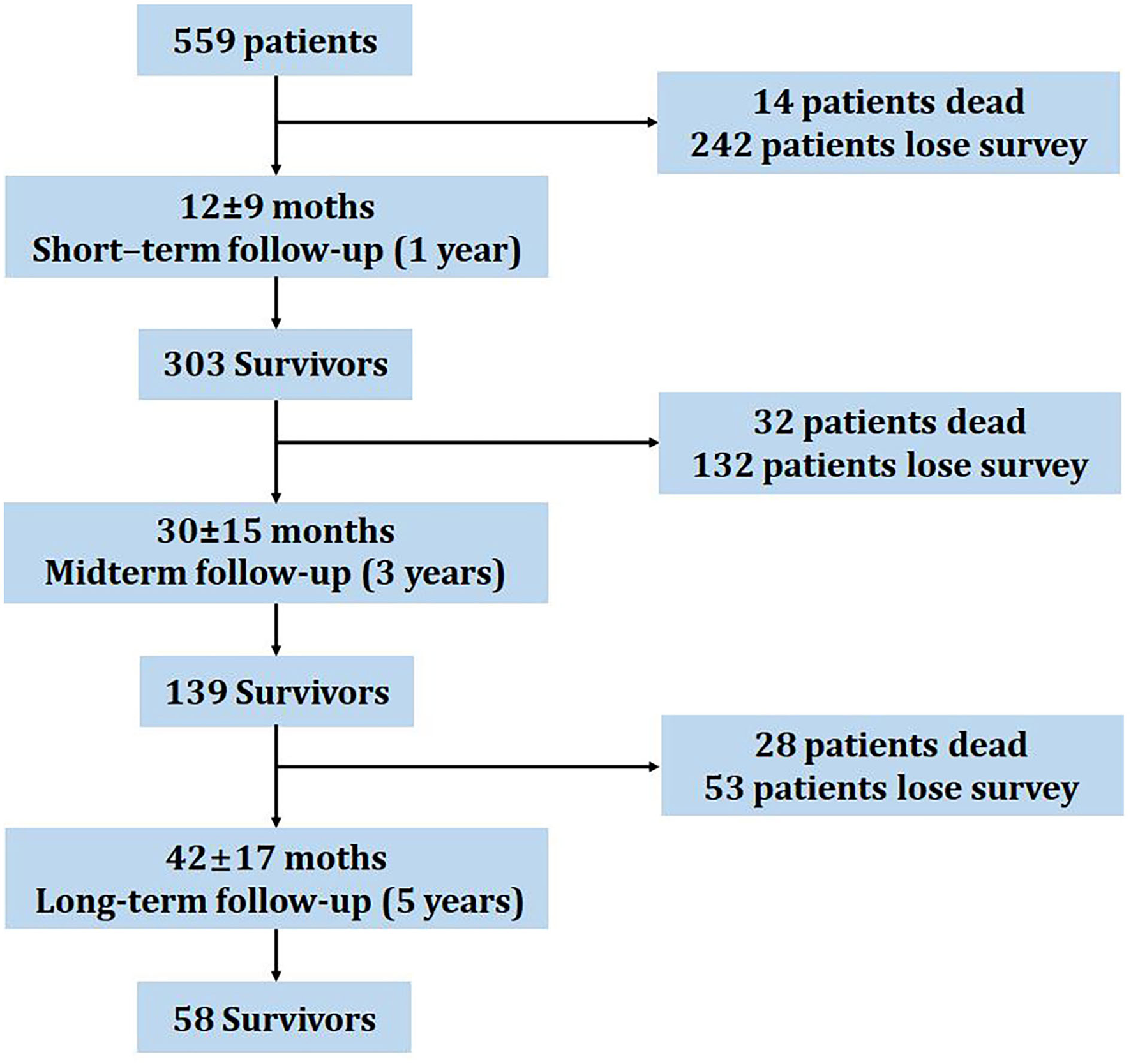 Figure 1 describes the patient flow. A total of 559 patients with PH initially completed self-report measures of generic HRQOL who were diagnosed with PH by RHC. Patients completed questionnaires during the follow-up. During the follow-up, survivors who were not able to return the questionnaires or dead patients were excluded from the study. After a mean 12 ± 9 month-interval follow-up (short-term), 32 patients (4%) died and 132 patients (24%) were lost to follow-up. Accordingly, the remaining 303 surviving patients had a second follow-up after 30 ± 15 months (midterm). The last survey was completed after 5 years (42 ± 17 months, long-term) from the remaining 139 survivors. Patients with any mental disorder who could not understand and fill out the questionnaires by themselves were excluded from the study.