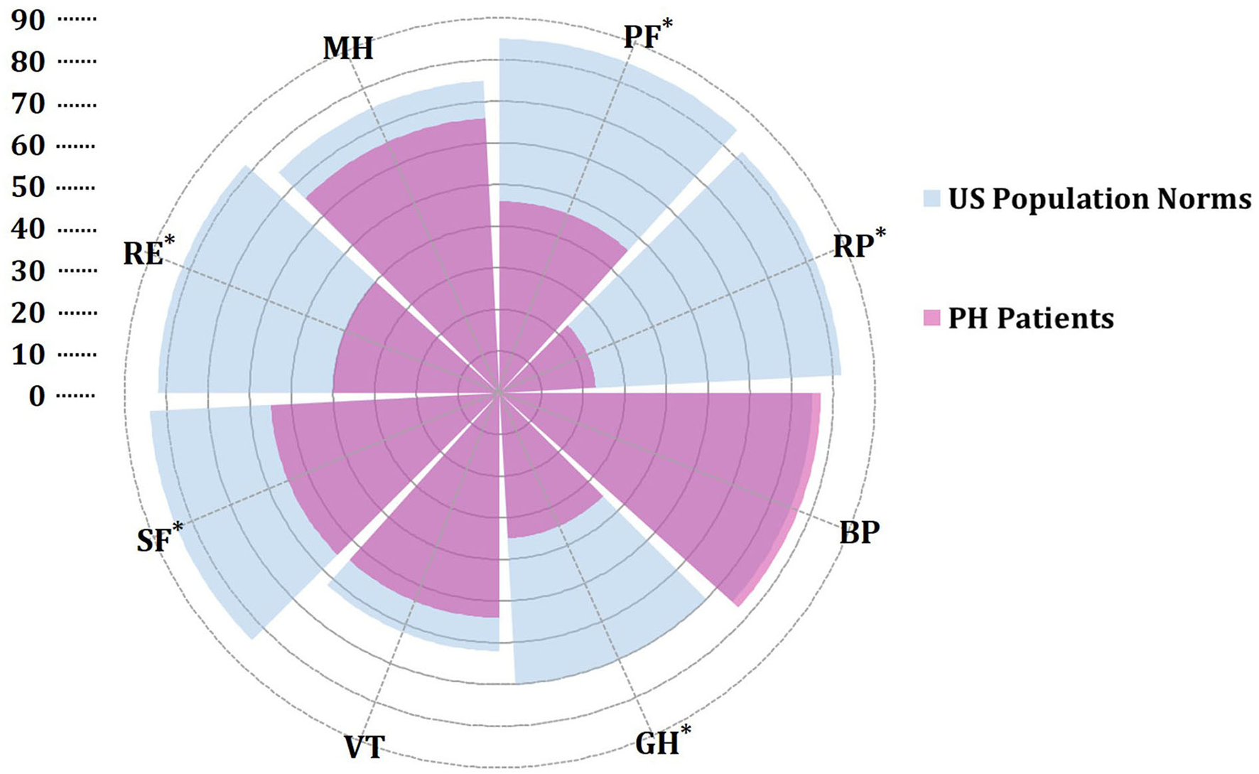 Rose radar plot of the individual domain in pulmonary hypertension (PH) vs. U.S. population normative values. All values are presented as means. *A p < 0.05 for comparison with U.S. population norms. Purple represents SF-36 scores in patients with PH. Blue represents SF-36 scores of U.S. population norms from the literature (21). BP, body pain; GH, general health; MH, mental health; PF, physical functioning; RE, role emotional; RP, role physical; SF, social functioning; VT, vitality.