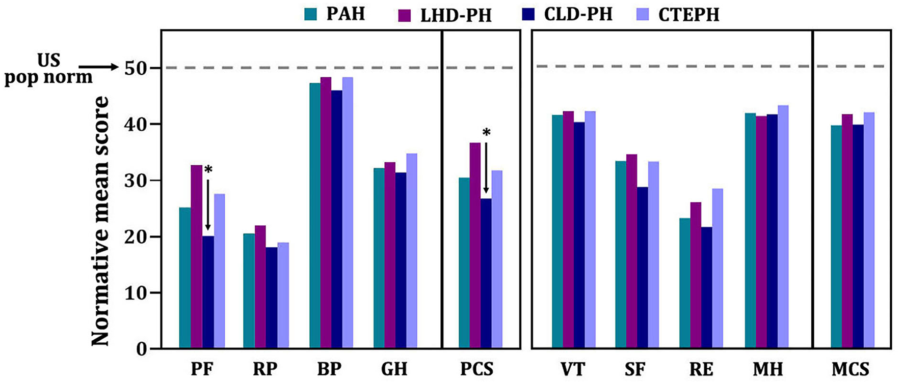 SF-36 scores of patients with pulmonary hypertension in different diagnosis types. Normative mean scores based on U.S. norm population are shown. Numerically higher scores represent better health-related quality of life. *A p < 0.05 indicates comparison among different diagnosis types in each domain or summary score. BP, body pain; GH, general health; MH, mental health; PF, physical functioning; RE, role emotion; RP, role physical; SF, social functioning; VT, vitality.