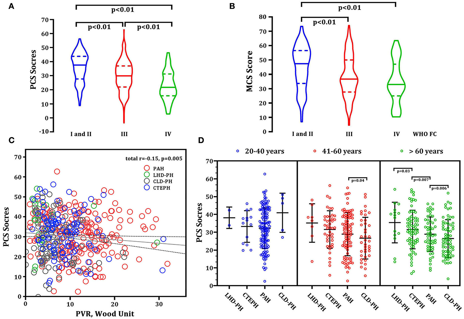 Correlations between baseline HRQOL and demographics and PVR. (A) PCS score vs. WHO FC severity; (B) MCS score vs. WHO FC severity; (C) PCS score vs. PVR (linear model: r2 = 0.15, p = 0.005). Red circles represent patients with PAH. Green circles represent the patients with LHD-PH. Gray circles represent CLD-PH. Blue circles represent CTEPH. (D) PCS scores at different ages and in different disease types. CLD-PH, pulmonary hypertension due to lung disease and/or hypoxia; CTEPH, chronic thromboembolic pulmonary hypertension; LHD-PH, pulmonary hypertension due to left heart disease; MCS, mental component summary; PAH, pulmonary arterial hypertension; PCS, physical component summary; PVR, pulmonary vascular resistance; WHO FC, World Health Organization functional class.