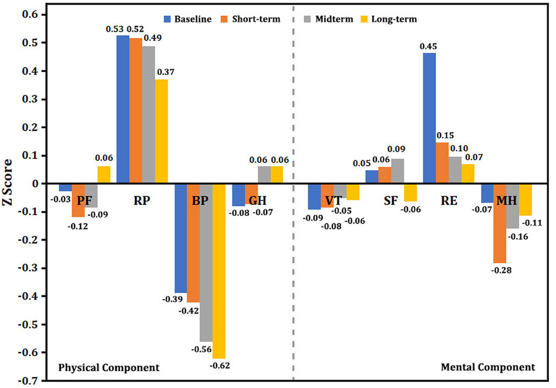 We used the Z score to interpret the changing trend in health status. As shown in Figure 5, the baseline physical component (PF, BP, and GH) and mental component (VT and MH) summary scores were significantly lower than the normative scores, but RP, SF, and RE were not lower than the mean score of norms. The long-term results of the Z score in the physical component summary showed that RP and BP tended to decline continuously, but PF and GH subscales significantly improved at the 5-year follow-up. Importantly, the Z score in the mental component seemed to persistently decrease from baseline to midterm and long-term follow-ups. Especially for SF and RE, the Z score was significantly reduced from 0.05 (baseline) to −0.06 (5-year follow-up) for SF as well as 0.45–0.07 for RE. At the end of the follow-up, there were 54 surviving patients, including 35 patients with PAH, nine patients with CLD-PH, and 10 patients with CTEPH who completed all questionnaires at each follow-ups. Similar results were observed in these patients, such as Z score of PF and GH significantly increased (see Supplementary Figures 1–4), whereas the Z scores of SF and RE showed a marked decrease from the baseline to long-term follow-up.