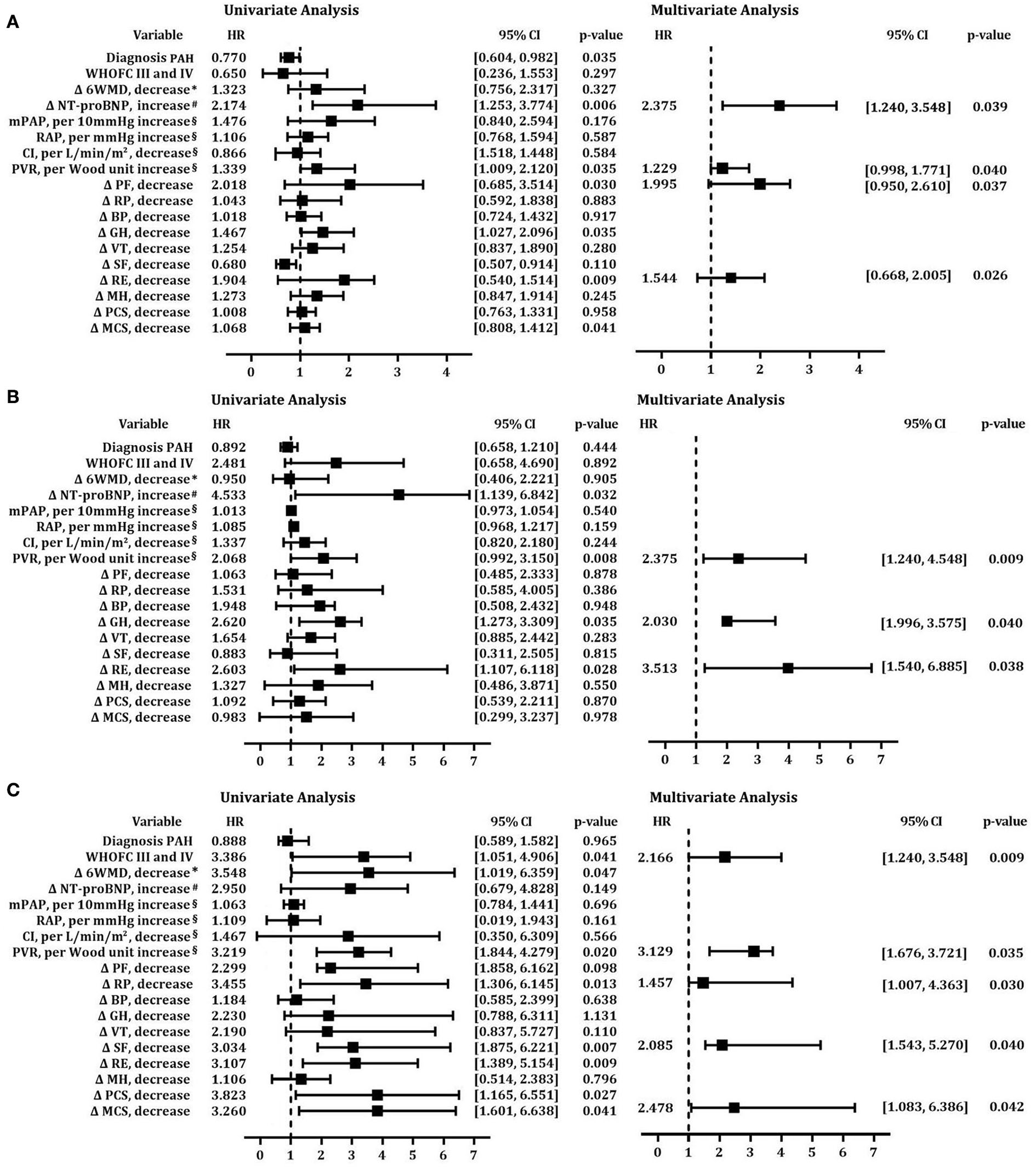 Cox proportional hazards regression was used for determining risk factors for mortality at short-term, midterm, and long-term follow-ups adjusted by gender and age. The prognostic values of the parameters were tested using univariate Cox proportional hazards regression analysis at each follow-up, such as clinical data (diagnosis of PAH, WHO FC III and IV, decrease in Δ6MWD, increased ΔNT-proBNP), baseline hemodynamic variables (increase in mPAP, RAP, and PVR, and decrease in CI), decrease in ΔSF-36 in each domain, ΔPCS, and ΔMCS. Variables were all incorporated into the forward stepwise multivariable Cox proportional hazards model if confounders were considered in the univariate analyses or the variables have clinical importance. A p-value of < 0.05 was considered statistically significant.
