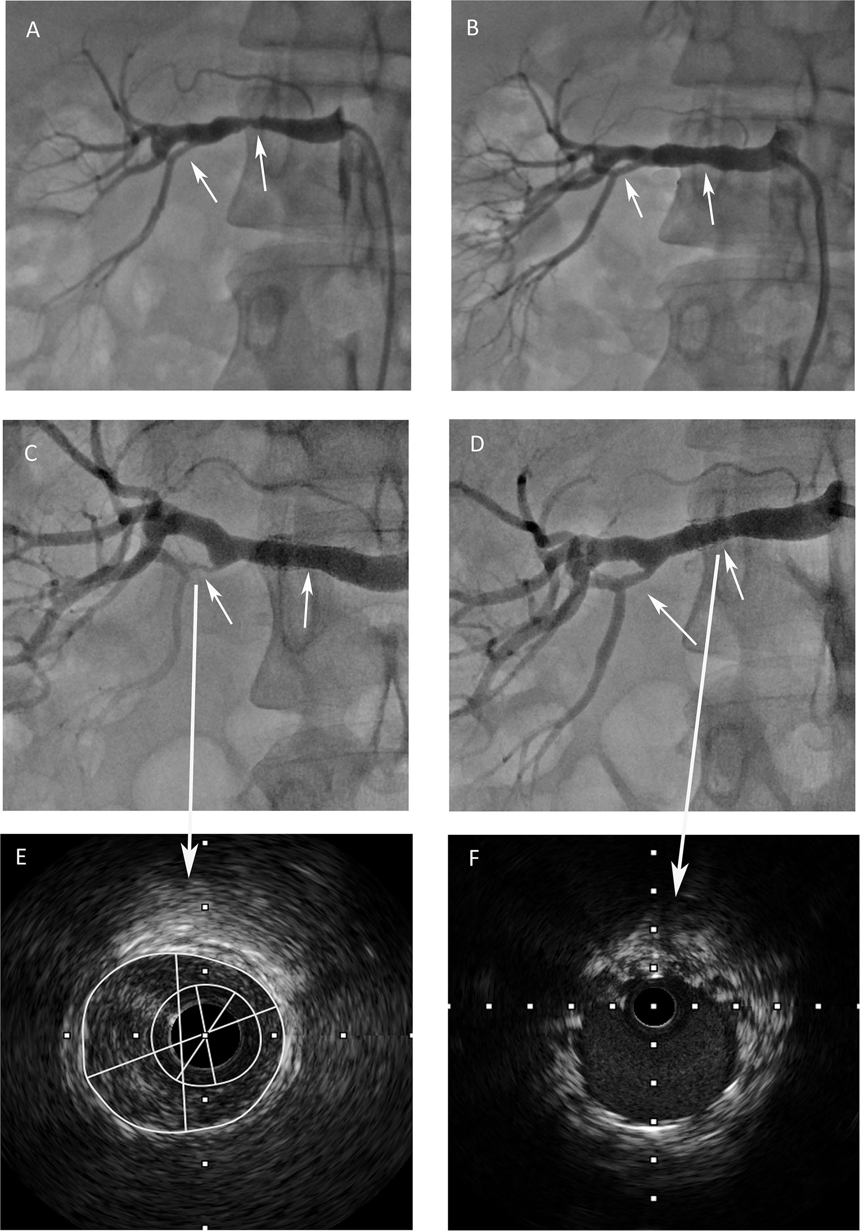 Figure 1. (A) Renal angiography revealed focal stenosis in the mid-portion of the right renal artery and the right inferior renal branch artery was normal. (B) After a stent was implanted into the renal artery, the right inferior renal branch artery was still normal. (C) Severe stenosis was found in the right inferior renal branch artery, no obvious in-stent restenosis was observed. (D) The lesion vessel was dilated successfully and the renal blood flow was restored after the procedure. (E) Intravascular ultrasound image revealed eccentric intimal thickening of the branch artery. (F) Intravascular ultrasound image revealed that no obvious neointimal hyperplasia in the stent.