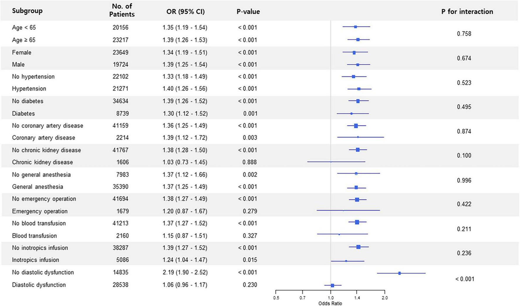 A total of 83,097 patients were enrolled in this study. The study patients were divided into the low (57,838 [69.6%]) and high (25,259 [30.4%]) LAVI groups. After an adjustment, higher LAVI was associated with increased incidence of POAF (5.1% vs. 8.1%; odds ratio [OR], 1.33; 95% confidence interval [CI], 1.25–1.41; p < 0.001). In 24,549 pairs of propensity-score-matched population, the result was similar (6.2% vs. 7.9%; OR, 1.30; 95% CI, 1.21–1.39; p < 0.001). The estimated threshold of LAVI associated with POAF was 36.4 mL/m2 with an area under the curve of 0.571. Subgroup analysis in non-thoracic and thoracic surgery showed that the association between preoperative LAVI and POAF significantly interacted with diastolic dysfunction (p for interaction < 0.001), and the observed association was valid in patients without diastolic dysfunction.