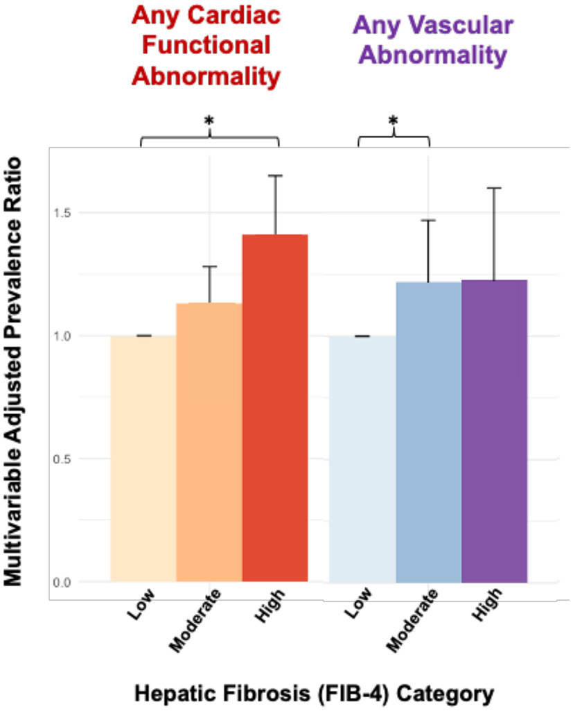 Of the 1668 patients studied (mean age: 55.971 ± 7.28, 901 [54%] male), 85.9% had ≥1 cardiac abnormality with increasing prevalence seen within the low (82.0%) to moderate (88.8%) to high (92.3%) FIB-4 categories. Multivariable analyses demonstrated the presence of any cardiac abnormality was significantly associated with having a high-range FIB-4 (prevalence ratio 1.07, 95% CI: 1.01–1.13); notably, the presence of functional cardiac abnormalities were associated with being in the high FIB-4 range (1.41, 1.21–1.65) and any vascular abnormalities with being in the moderate FIB-4 range (1.22, 1.01–1.47).