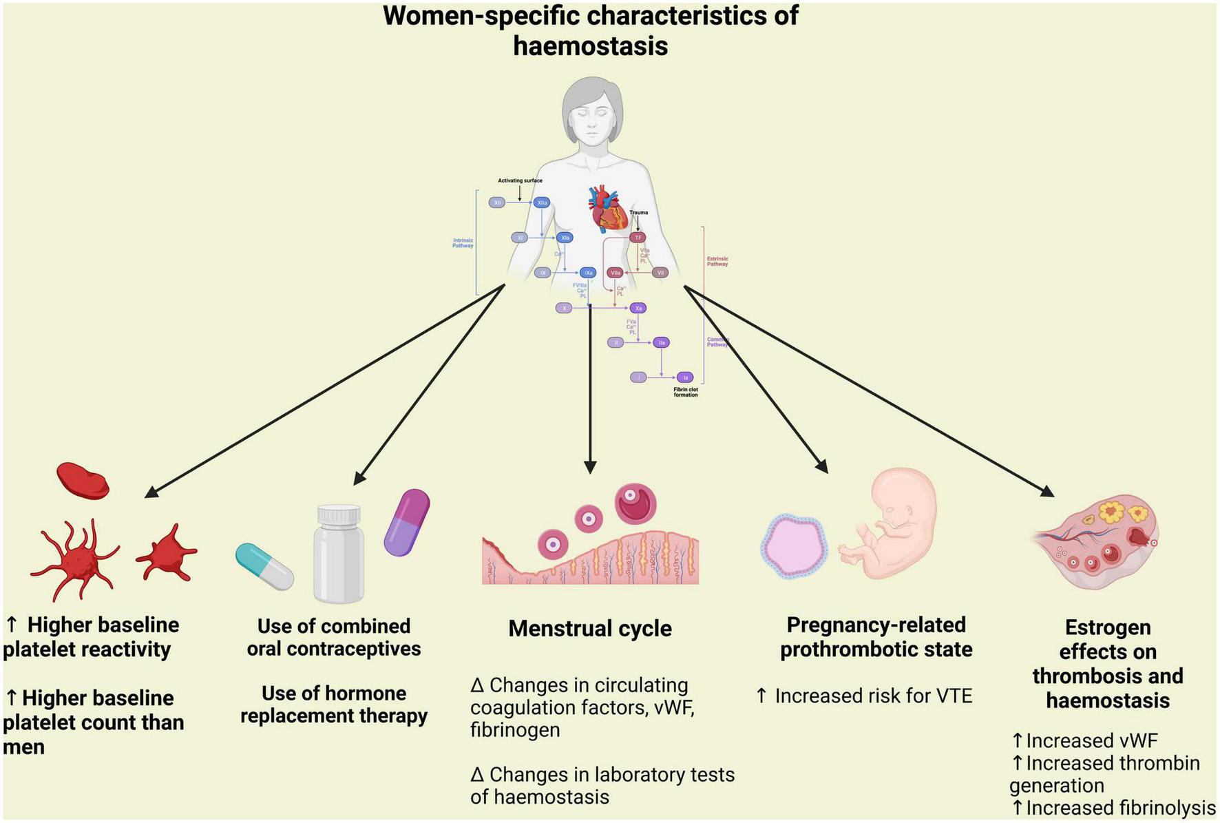 Peculiarity of hemostasis in women in terms of platelet aggregation and coagulation associated with pregnancy and hormonal status. vWF, Von Willebrand factor; VTE, venous thromboembolism.