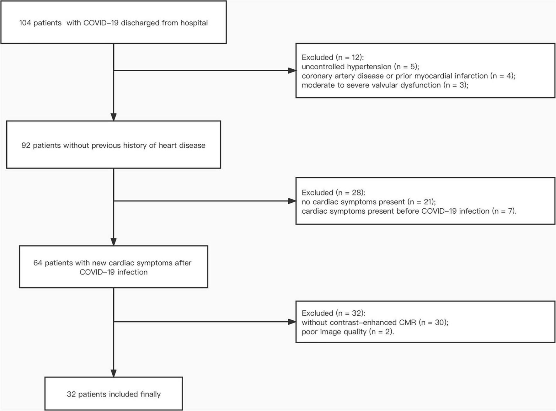 In this prospective observational study, a total of 32 patients who had COVID-19 (11 diagnosed as severe COVID-19 and 21 as moderate) with persistent cardiac symptoms after hospital discharge were enrolled. Contrast-enhanced cardiovascular magnetic resonance (CMR) imaging was performed on all patients. Comparisons were made with age- and sex-matched healthy controls (n = 13), and age-, sex- and risk factor-matched controls (n = 21). Further analysis was made between the severe and moderate COVID-19 cohorts.