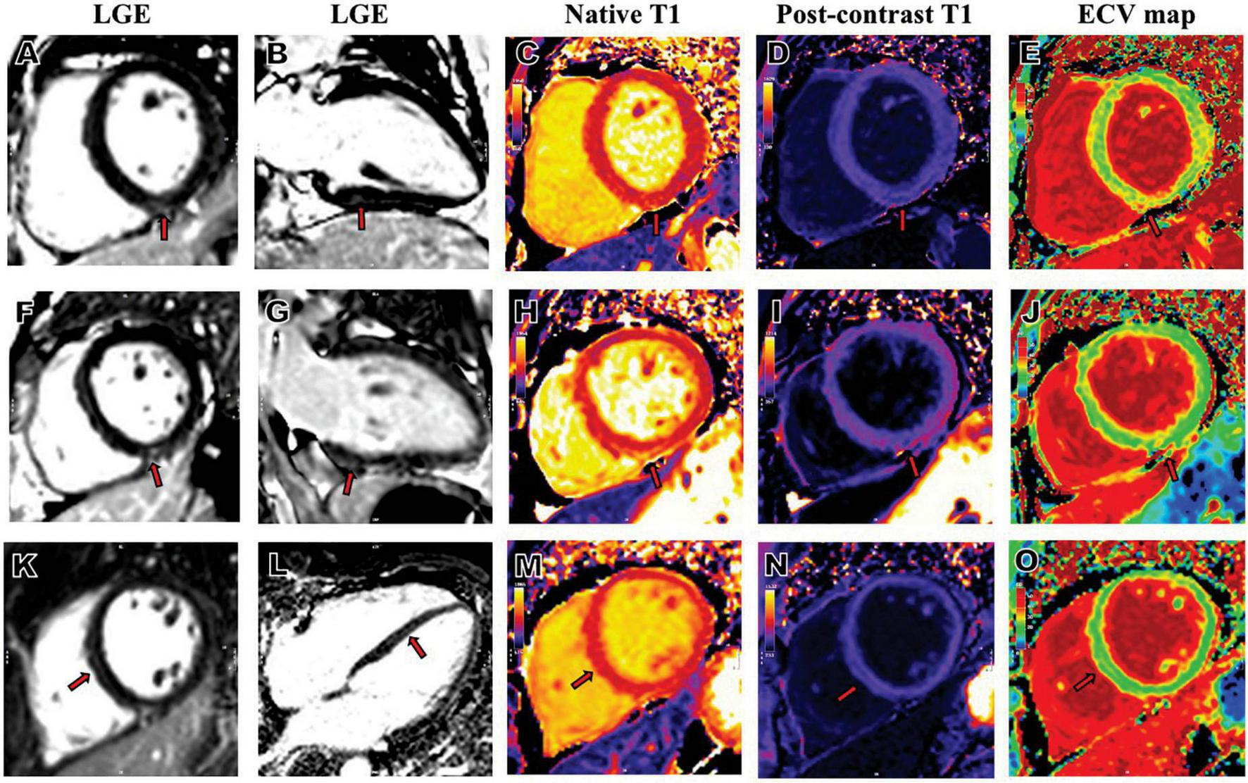 LV morphological and functional parameters, including cardiac volumes, mass, function, and strain, were obtained using the automated endocardial and epicardial contours detection and manually corrected if required. Global T1 and T2 values were measured by manually delineating the epicardium and endocardium of the whole LV myocardium region on T1 and T2 maps, which included LGE-positive regions. Extracellular volume (ECV) fraction was derived by native T1 and post-contrast T1 of the blood pool and myocardium (5). Hematocrit was measured within three days before CMR scanning.