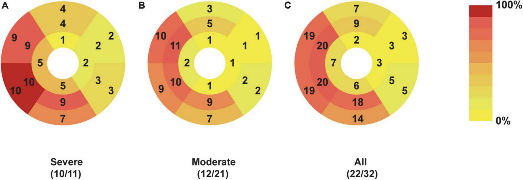This prospective observational study was performed between April and June 2021. Inclusion criteria were: (1) patients with confirmed COVID-19 by RT-PCR on nasopharyngeal swab during hospitalization between January and March 2020; (2) patients volunteered for contrast-enhanced CMR examination; (3) patients suffered from persistent cardiac symptoms such as palpitation, chest pain or chest tightness after hospital discharge (8). Exclusion criteria included: (1) history of previous heart disease including myocarditis, cardiomyopathy/heart failure (dilated, hypertrophic, non-ischemic, ischemic), uncontrolled hypertension, coronary artery disease or prior myocardial infarction, moderate to severe valvular dysfunction, valve replacements, arrhythmias (such as atrial fibrillation, atrial flutter, or ventricular tachycardia), congenital heart disease; (2) cardiac symptoms present before COVID-19 infection or without persistent cardiac symptoms; (3) unwilling and/or unable to undergo contrast-enhanced magnetic resonance imaging; or (4) poor image quality due to severe arrhythmia (atrial fibrillation, premature ventricular beats, etc.) or inability to hold breath. Clinical, demographic characteristics, cardiac symptoms and blood test results were recorded on the day of CMR examination (12). Study patients were classified into moderate and severe COVID-19 subgroups according to the World Health Organization criteria (14, 15). The diagnostic criteria for patients with severe COVID-19 pneumonia were the presence of one of the following during hospitalization: respiratory rate > 30 breaths/min; severe respiratory distress; or SpO2 ≤ 93% on room air according to the WHOs interim guidance and the fifth edition of the “Pneumonia Diagnosis and Treatment Plan for New Coronavirus Infection” in China (15, 16). The remaining patients in our study who required hospitalization for observation and supportive care were defined as the moderate subgroup (14). This study was approved by the local ethics committee of our institution (2021-S114). All participants provided written informed consent.