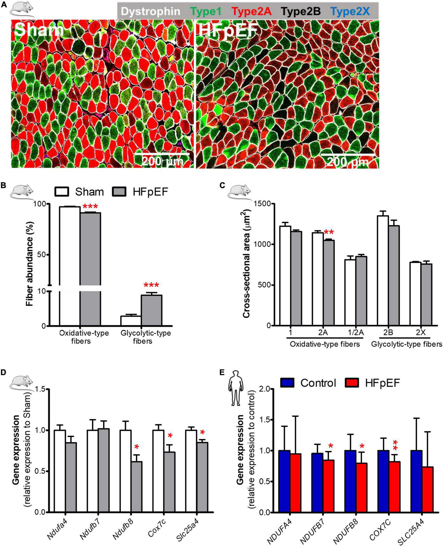 Decreased oxidative fiber, fiber atrophy, and downregulation of mitochondrial oxidative genes in HFpEF. (A) In mice, representative confocal images showing staining of dystrophin (white) and type-1 (green), type-2A (red), type-2X (blue) fibers in soleus muscle. (B) Quantitative analysis showing the abundance of oxidative-type and glycolytic-type fibers, and (C) the cross-sectional area size of each individual fiber type in Sham and HFpEF mice (n = 7-11/group). (D) Quantitative analysis of the relative expression of mitochondrial oxidative genes – Ndufa4, Ndufb7, Ndufb8, Cox7c and Slc25a4 in Sham (n = 5-7) and HFpEF mice (n = 6-15). (E) In humans, quantitative analysis of relative gene expression of NDUFA4, NDUFB7, NDUFB8, COX7C and SLC25A4 in vastus lateralis muscle of control (n = 12-13) and HFpEF patients (n = 10). Mice and human data are presented as mean ± SEM and mean ± SD, respectively. Statistical analysis by Student t test for normally distributed data or Mann-Whitney U test for non-distributed data. *P < 0.05, **P < 0.01, ***P < 0.001 vs. Sham mice or control subjects. NADH: ubiquinone oxidoreductase (NDU) subunit A4, Ndufa4; NDU subunit B7, Ndufb7; NDU subunit B8, Ndufb8; Cytochrome C oxidase subunit 7C, Cox7c; Adenine nucleotide translocator 1, Slc25a4.