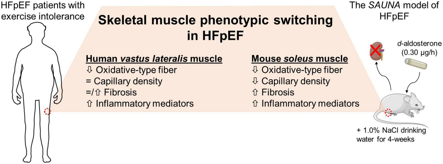 Exercise intolerance and limitations in aerobic capacity are central features of HFpEF (8, 9). Prior studies suggest that, in addition to cardiac dysfunction, non-cardiac peripheral factors including skeletal muscle (SkM) phenotypic switching, contribute to the reduced physical activity present in HFpEF patients (10–16). Similarly, SkM myopathy and dysfunction are also observed in comorbidities that are commonly seen in HFpEF patients such as hypertension (17), chronic obstructive pulmonary disease (18, 19), obesity (20, 21), chronic kidney disease (22), diabetes mellitus (23, 24), etc. As such, these extracardiac comorbidities may also contribute to the SkM phenotype seen in these patients and to the overall poor outcome (25). SkM phenotypic switching includes, among others, muscle atrophy (26, 27), fiber composition shift (16, 28), decreased capillary density (28) and altered secretion of SkM-derived factors (29–31). While this suggests that a SkM-directed approach might be beneficial, the development of targeted therapies is hindered by the lack of preclinical models that recapitulate the SkM phenotypic switching seen in HFpEF patients (32).