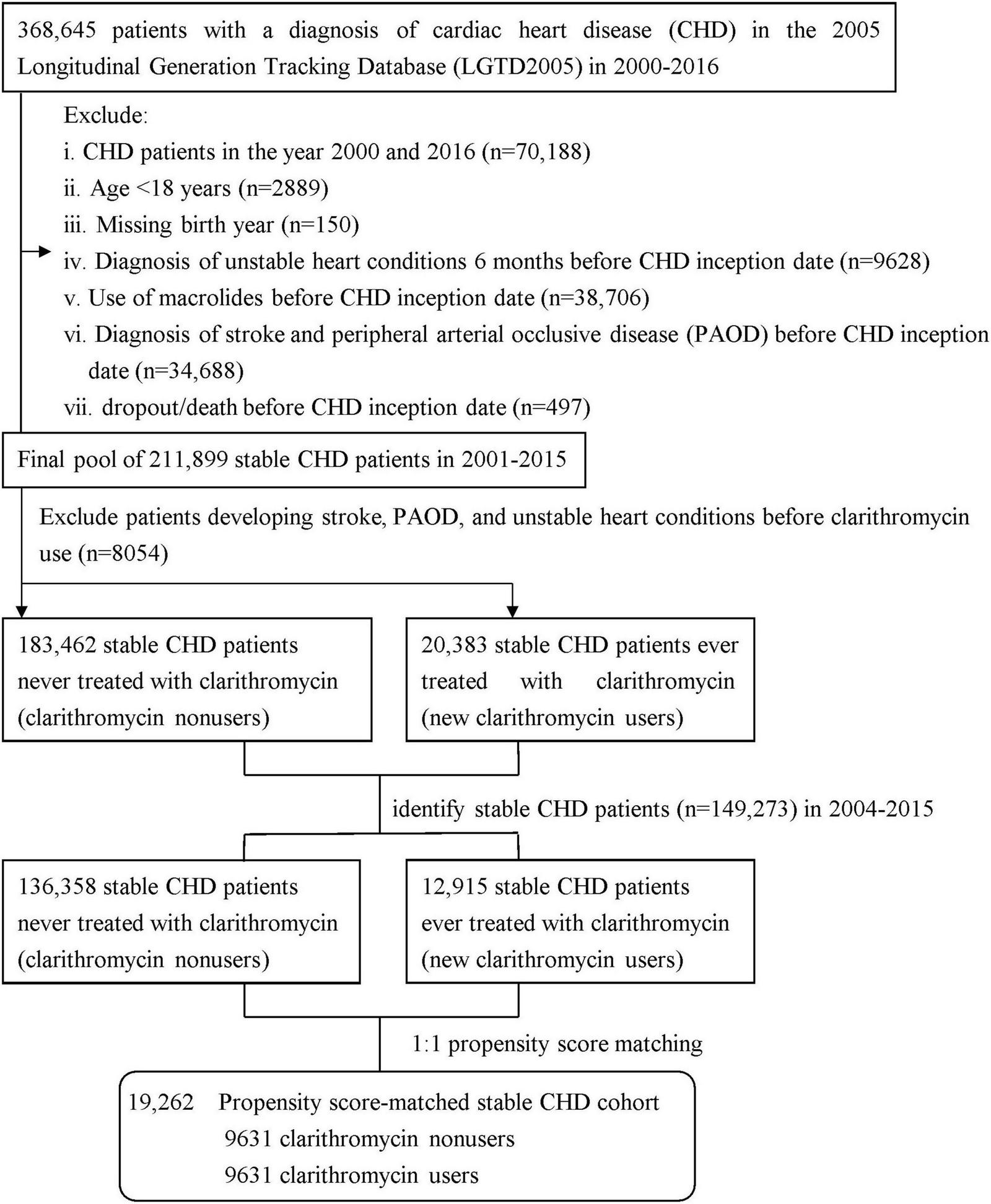 Cardiovascular disease (CVD) is a growing worldwide burden, with approximately 17 million deaths globally in 2017, and is estimated to be over 23 million in 2030 (1). CVD includes coronary heart disease (CHD), and chronic infection has been advocated as a possible contributing factor to CHD (2). Several infectious agents, such as Chlamydia pneumoniae, Helicobacter pylori, cytomegalovirus, and herpes simplex virus (3, 4), were associated with the development of atherosclerosis. Besides, inflammation also mediates atherogenesis (5). These findings supported the hypothesis that some microorganisms were related to coronary artery disease. In addition to antiplatelet drugs, previous studies also investigated antibiotics as potential secondary prevention agents (6–10). They evaluated the safety and efficacy of macrolide antibiotics in patients with CHD. In an earlier study (11), C. pneumoniae was eradicated from atherosclerotic plaques using roxithromycin (a macrolide antibiotic) so roxithromycin might be helpful for patients with CHD. Therefore, several prospective, randomized, placebo-controlled trials investigated the role of macrolide antibiotics and the risk of cardiovascular events (6–10). However, the efficacy of macrolide antibiotics was conflicting in these studies. It is hard to decide if the macrolide antibiotics were effective or ineffective in CHD as secondary prevention because their dosages, durations, the timing of dispensing, and even the baseline characteristics of treated subjects were not comparable between the above mentioned studies. Besides, all enrolled subjects did not show any indication for antibiotics use such as acute infection in those prospective studies. That is, antibiotics were just used as secondary prevention for CHD. Other observational studies also reported the outcomes of clarithromycin for cardiac events among patients with acute infectious disease (12–16). These observational studies still showed conflicting results.