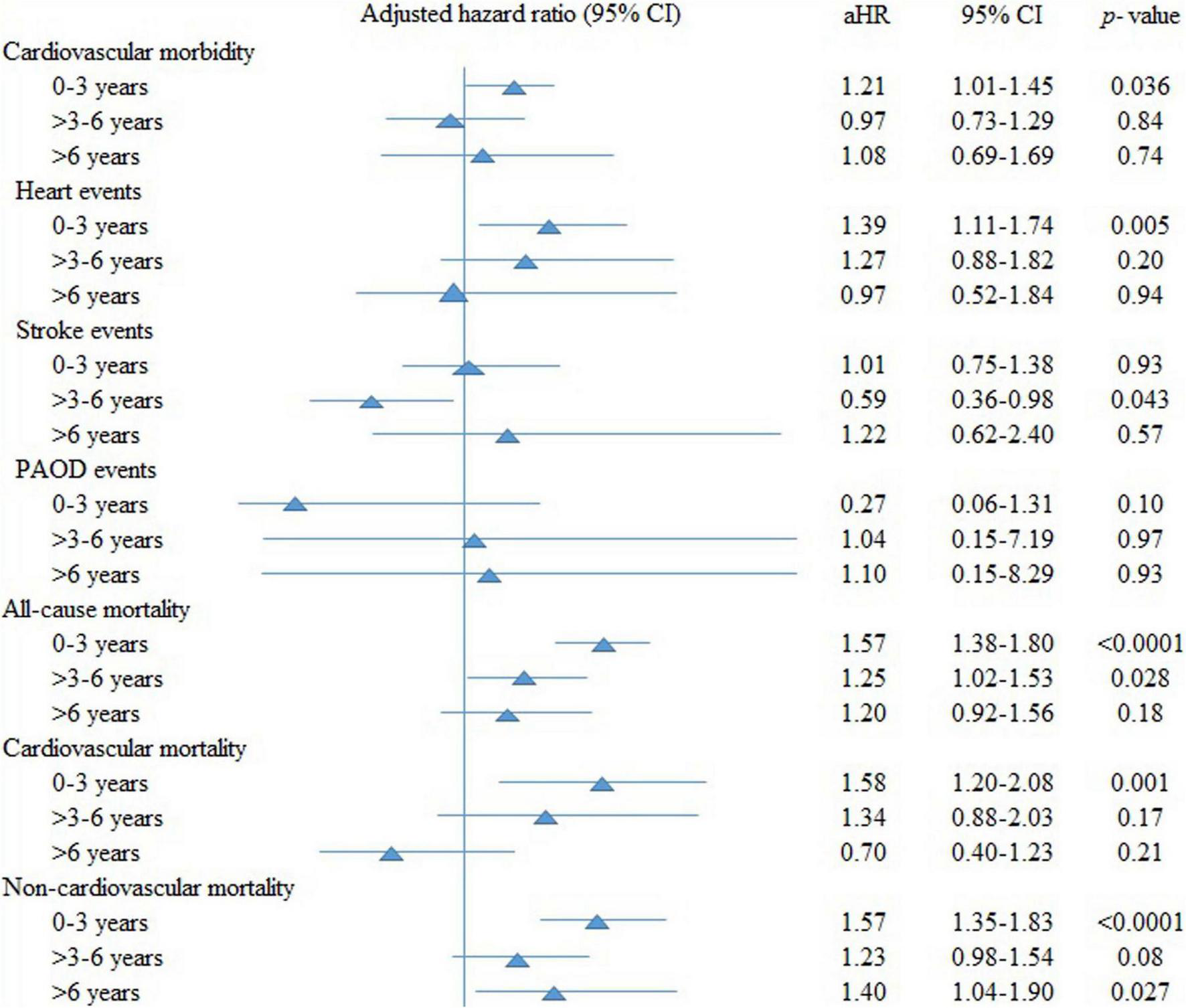 In multivariable Cox regression analysis (Table 2), clarithromycin use was significantly associated with increased risk for all-cause (aHR, 1.43; 95% CI, 1.29–1.58, p < 0.0001), cardiovascular (1.35; 1.09–1.67, p = 0.005), and non-cardiovascular (1.45; 1.29–1.63, p < 0.0001) mortality, not cardiovascular morbidity (1.09; 0.94–1.26, p = 0.26) in the presence of competing mortality.