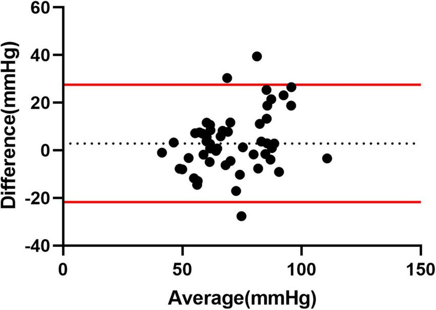 Multiple linear regression showed that PASPcal had a good correlation with PASP from RHC (R2 = 0.560, P < 0.001). The formula was as follows: PASPcal = 0.609*ePASP + 0.187*TAPSE − 0.182*FAC + 0.153* RAP + 0.12*RAA − 0.128*RV/LV − 0.153*LVGLS + 0.135* RVGLS. Bland-Altman plot also showed great agreement between PASPcal and PASP (Figure 2). Intra-class correlation coefficients of GLS and myocardial work parameters were shown in Table 2.