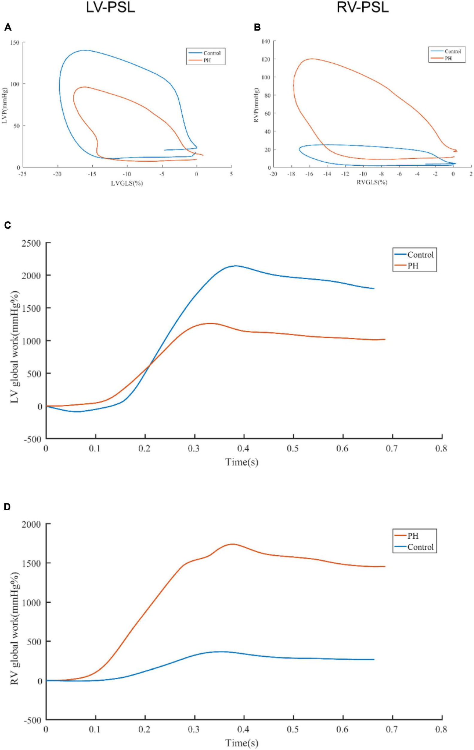 Representative pressure-strain loops and global work curves. The difference of LV-PSL (A) and RV-PSL (B) between PH patients and control was shown. The difference of LV global work curve (C) and RV global work curve (D) was shown. LV-PSL, left ventricular pressure-strain loop; RV-PSL, right ventricular pressure-strain loop.