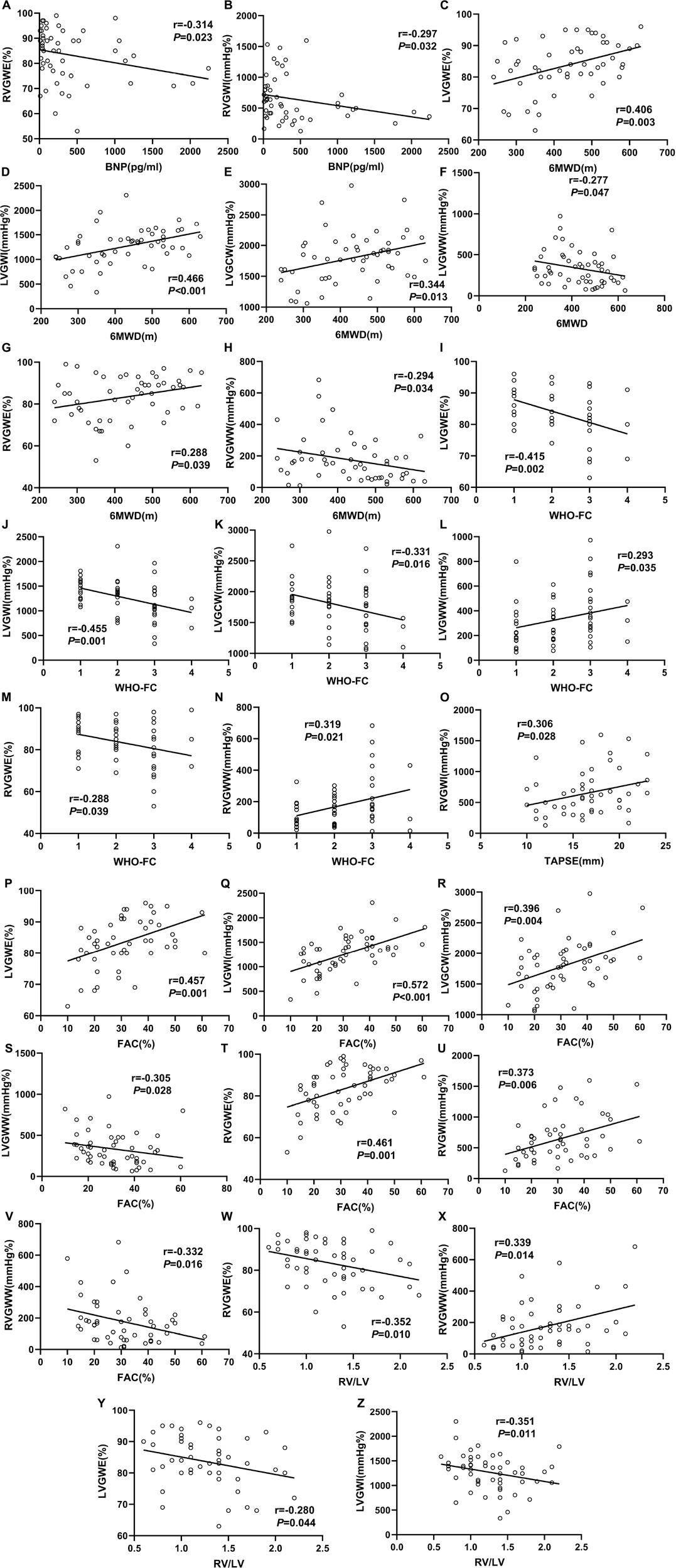 The representative PSL and global work curves of participants were presented in Figure 3. As summarized in Table 3, PH patients had higher ePASP (74.0 ± 27.4 vs 25.2 ± 2.6 mmHg, P < 0.001), RAA (18.2 ± 6.6 vs 10.7 ± 2.0 cm2, P < 0.001), RV/LV (1.3 ± 0.4 vs 0.7 ± 0.1, P < 0.001), LVGLS (−15.3 ± 3.4 vs −19.3 ± 2.0%, P < 0.001), RVGLS (−13.5 ± 4.3 vs −21.8 ± 2.5%, P < 0.001) and lower TAPSE (16.5 ± 3.5 vs 24.0 ± 3.2 mm, P < 0.001), FAC (31.2 ± 12.2 vs 52.1 ± 6.7%, P < 0.001) than controls. However, there was no significant difference in LVEF (69.9 ± 5.7 vs 67.6 ± 3.9%, P = 0.075). Compared to the controls, LVGWW [296.5 (172.0, 461.5) vs 110.0 (83.0, 130.0), P < 0.001], RVGWI [571.5 (373.5, 796.0) vs 352.0 (314.0 412.0), P < 0.001], RVGCW [793.5 (624.5, 1,173.0) vs 474.0 (435.0, 526.0), P < 0.001] and RVGWW [151.5 (60.5, 223.0) vs 38.0 (23.0, 57.0), P < 0.001] were significantly increased in PH patients. LVGWE [84.0 (80.0, 90.0) vs 94.0 (93.0, 95.0), P < 0.001], LVGWI [1,330.0 (1,061.3, 1,467.5) vs 1,560.0 (1,364.0, 1,884.0), P < 0.001], LVGCW [1,810.0 (1,494.8, 2,024.5) vs 1,989.0 (1,795.0, 2,323.0), P = 0.004], and RVGWE [85.0 (76.3, 92.5) vs 92.0 (90.0, 95.0), P = 0.001] were significantly lower in PH patients than controls.