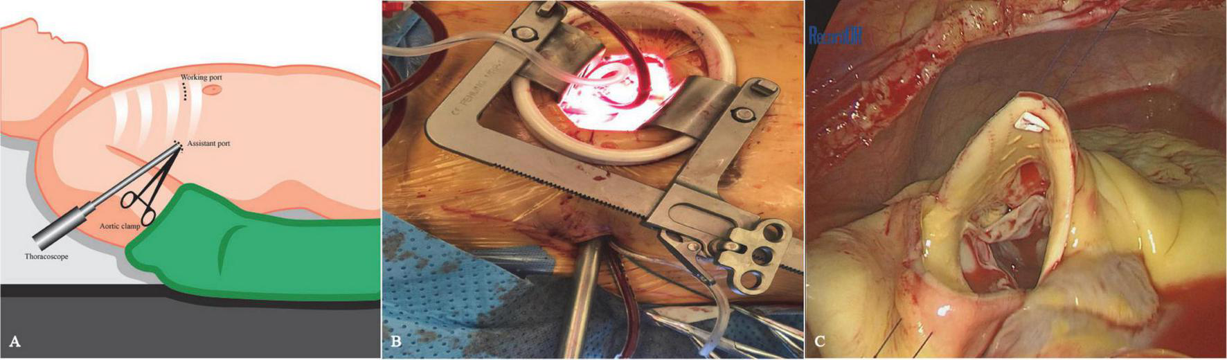Schematic diagram of the thoracoscopic procedure. (A) The patient was positioned in a supine position with the right chest elevated by 15 degrees. The working port was placed at the third intercostal space on the mid-clavicular line, while the thoracoscopic port was made in the third intercostal space at the level of the anterior axillary line. (B) Thoracoscopic approach view. (C) To fully expose the aortic root, two or three retraction sutures were placed over the transected aorta.