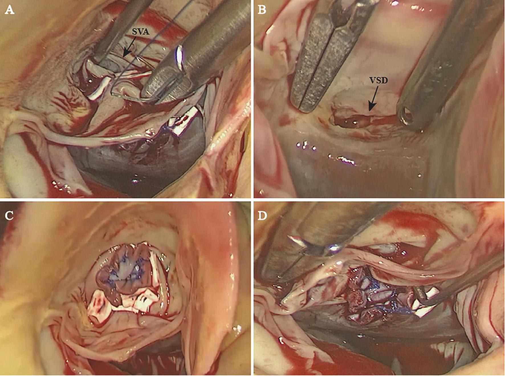 The sinus of Valsalva with a ruptured right coronary sinus (A) and the ventricular septal defect (B) were exposed well through the endoscope. The sinus of Valsalva aneurysm (C) and the ventricular septal defect (D) were successfully repaired with a patch. SVA, sinus of Valsalva aneurysm; VSD, ventricular septal defect.