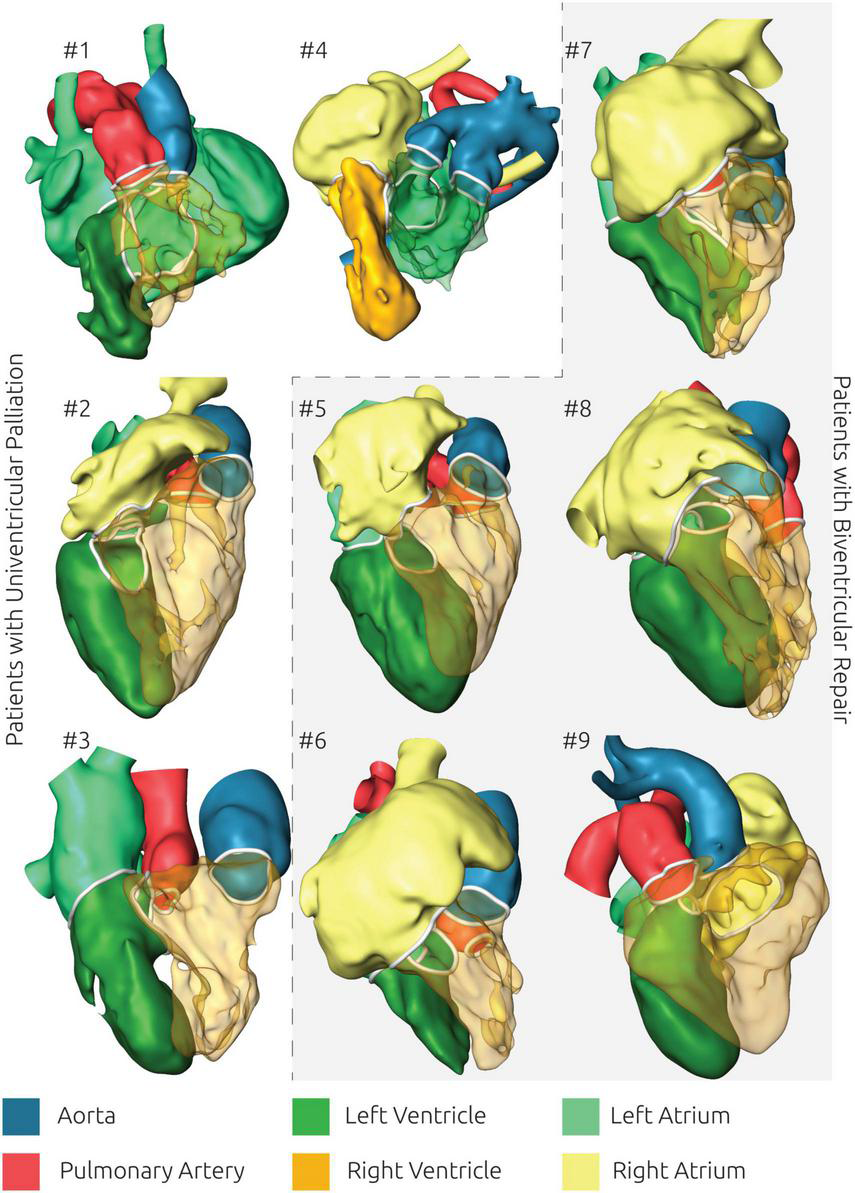 The individual cardiovascular anatomy of nine patients with complex DORV, in whom surgical decision-making was not straightforward, was reconstructed from either computed tomography or magnetic resonance imaging data. 3D reconstructions were used to characterize the morphologic details of DORV, such as size and location of the ventricular septal defect (VSD), atrioventricular valve size, ventricular volumes, relationship between the great arteries and their spatial relation to the VSD, outflow tract obstructions, coronary artery anatomy, etc. Additionally, physical models were generated. Virtual and physical models were used in the preoperative assessment to determine surgical treatment strategy, either BVR vs. UVP.