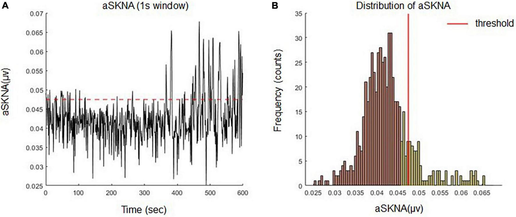 Recent studies have shown that signals with frequencies beyond 150 Hz on electrocardiography (ECG), usually considered as noise, can convey information about skin sympathetic nerve activity (SKNA) (1, 6). Although the method has been validated by invasive nerve recording showing that SKNA is consistent with stellate ganglion and thoracic sympathetic nerve activities (6, 7), the associations between the changes in the amplitude or frequency of SKNA firing and autonomic nervous system (ANS) control are still controversial. For example, the clustered firing of integrated SKNA (iSKNA; the sum of the activity over 100 ms) and elevated average SKNA (aSKNA; an average of iSKNA over 10 s) were found to be associated with both the initiation and termination of cardiac arrhythmias, such as AF and ventricular tachycardia (1, 8). Therefore, several short-term SKNA bursting analyses have been proposed to better represent the underlying sympathetic activity during different disease states, such as arrhythmogenicity in patients with coronary heart disease and changes in autonomic function in patients with acute myocardial infarction and critical illness (9–11).