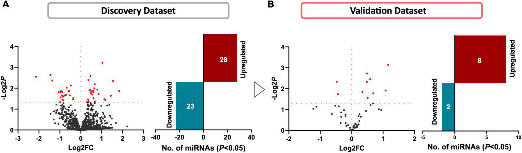 Identifying differentially regulated miRNAs in SWDM compared to SWoDM patients. Volcano plots show the number of differentially regulated miRNAs in SWDM versus SWoDM patients: red dots depict statistically significant (P < 0.05) and gray dots depict unsignificant miRNAs, while bar plots show the number of statistically significant miRNAs: downregulated in teal and upregulated presented in crimson color in (A) discovery and (B) validation datasets.