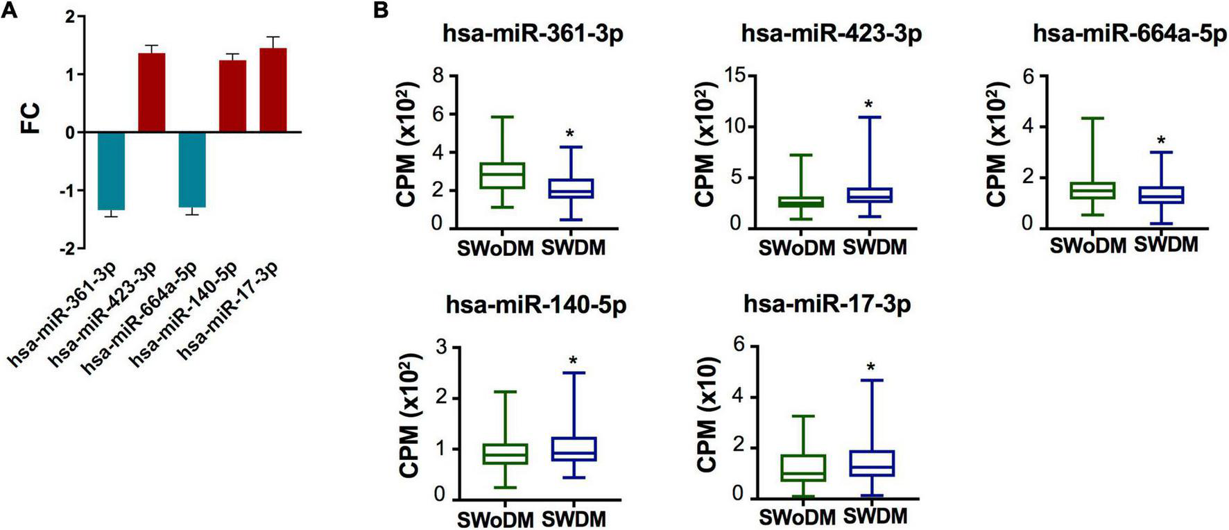 Validated miRNAs in SWDM patients compared to SWoDM patients. (A) Column plot shows the fold change (FC) and standard error of the mean (SEM) of FDR-significant validated, differentially regulated miRNAs (n = 5) in SWDM versus SWoDM patients: downregulated in teal and upregulated in crimson color. (B) Box and whiskers plots show the difference in counts per million (CPM) of the five validated miRNAs in SWDM and SWoDM patients. Mean with minimum and maximum values, upper and lower quartiles, and statistical significance (P < 0.05) marked by an asterisk (*) are shown for each dataset.