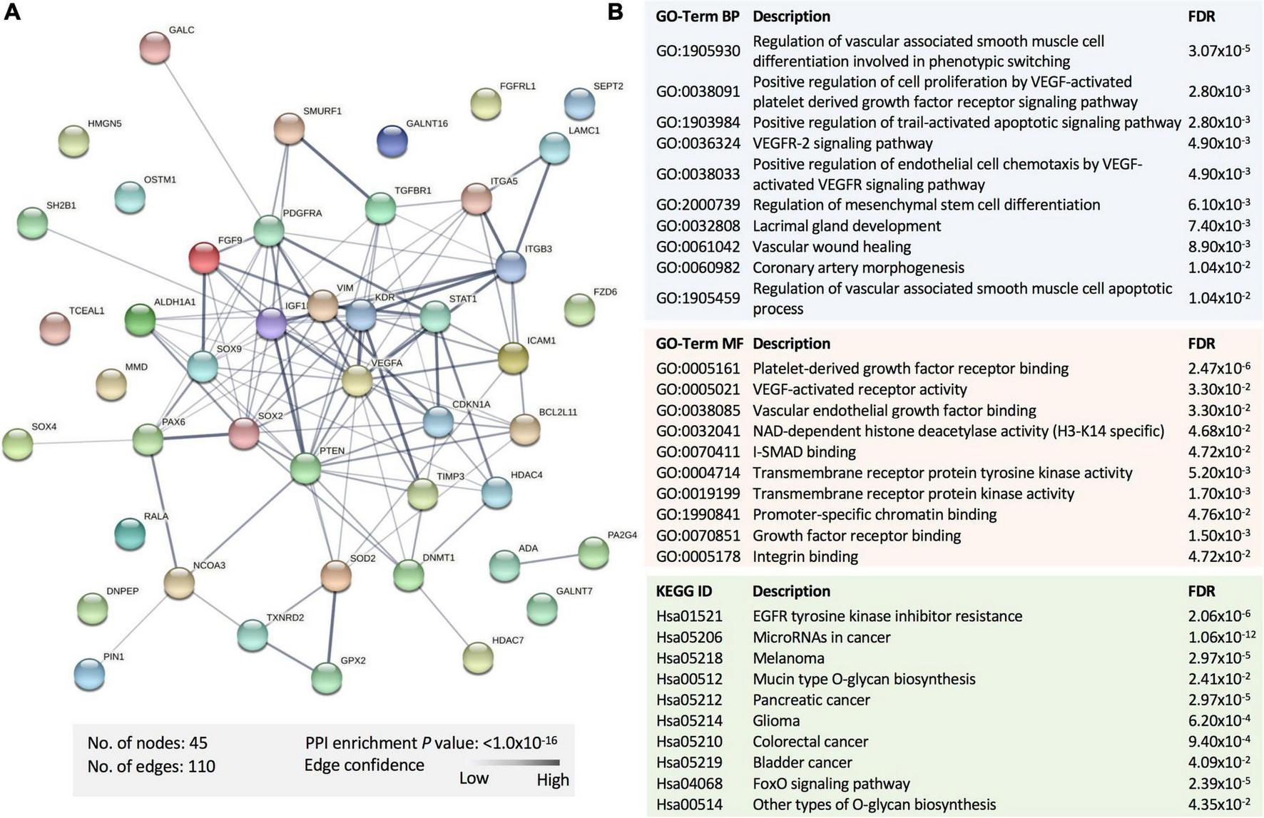 To explore the potential pathways affected by the panel of the statistically dysregulated five miRNAs in SWDM compared to SWoDM, we retrieved the experimentally validated molecular targets of these miRNAs in the miRTargetLink 2.0 database with strong experimental evidence. We compiled a list of 47 gene targets (Table 2). We first performed protein–protein interaction (PPI) and functional enrichment analysis of the proteins encoded by the 47 genes using STRING (Figure 4). The generated PPI network showed high statistical significance (P = 1.0 × 10–16) of the protein associations with strong involvement of VEGFA, STAT1, CDKN1A, and PTEN, among others (Figure 4A). Moreover, Gene Ontology (GO), biological process (BP), and molecular function (MF), and Kyoto Encyclopedia of Genes and Genomes (KEGG) pathway gene enrichment analysis predominantly showed vasculature-related pathways and the involvement of molecular pathways associated with disrupted homeostasis also observed in cancer (Figure 4B).