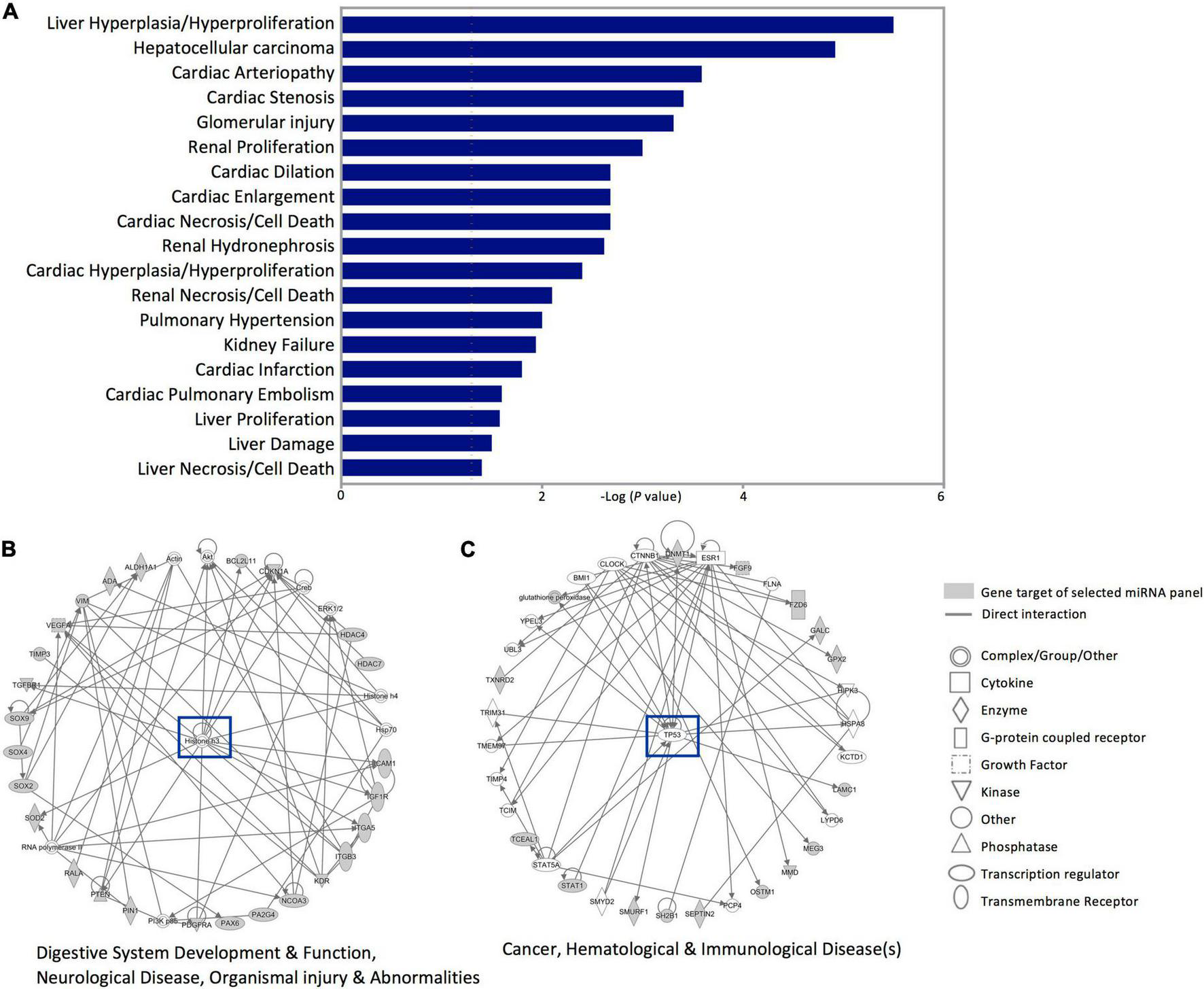 Next, investigating the clinical pathologies associated with these gene targets showed marked associations with cardiac anomaly-, hepatic-, and renal damage-related annotations (Figure 5A). In addition, the Ingenuity pathway and network analysis for the genes affected by dysregulated miRNAs in SWDM patients showed significant enrichment for two major pathways; histone H3 variants and TP53 canonical pathways. Gene networks related to histone H3 highlighted enrichment in gastric development and function, neurological disease and organismal injury and abnormalities, which include edema, hemorrhage and lesions (Figure 5B). Additionally, cancer, hematological and immunological disease-related pathways, mediated by TP53 gene network, were also annotated with interactions between miRNA panel gene targets (Figure 5C).