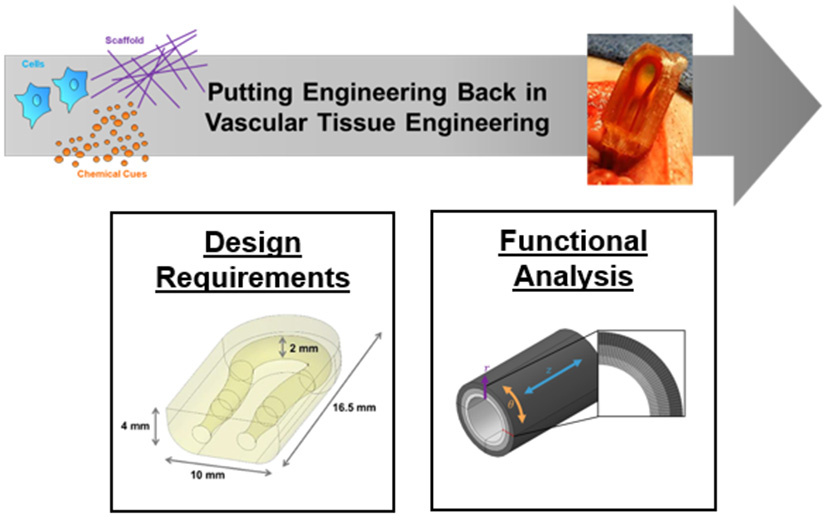 Vascular tissue engineering can be characterized as the creation of replacement blood vessels. Over the past 30 years, approaches have incorporated different combinations of extracellular matrix scaffolds, cells, and active bio-chemical cues. Challenged by the goal to recapitulate the complexity of big or small blood vessels, the clinical use of tissue engineered vessel replacements is still limited. With research more often focusing on reductionist materials science or cell biology characterization of vessel-like constructs, an opportunity has re-emerged to apply engineering approaches to guide the next step in vascular tissue engineering. The objective of this Research Topic is to highlight the impact of “engineering,” “engineering design,” and “engineering design verification” in advancing the design of tissue engineered blood vessels (Figure 1). The challenge of integrating cells, scaffolds, and bio-chemical cues into a functional vessel or network of vessels provokes the need to revisit design requirements, the potential role of computational modeling, the opportunity for new manufacturing technologies such as three-dimensional bio-printing, and the application of engineering fundamentals outside the traditional materials science or cell biology tool boxes. By providing examples that span current vascular tissue engineering approaches, the articles in this Research Topic highlight critical questions and opportunities for guiding future therapy development.