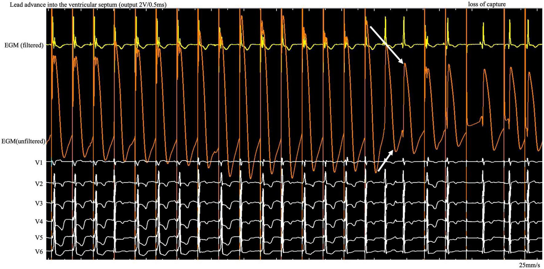Current of injury is a marker of active fixation electrode stability and the adequate capture threshold (10–12). COI, detectable on unfiltered EGM, is characterized by ST-segment elevation from baseline due to focal tissue trauma caused by the advancement of the lead tip into the septum. Su et al. described the COI abruptly disappeared when perforation happened (13). Ponnusamy et al. demonstrated that decreased COI amplitude differed significantly before versus after perforation (COI amplitude decreased from 15.4 ± 11.6 to 0.9 ± 0.6 mV) (3). However, the current intermittent pacing technique cannot monitor unfiltered EGM in real time. Therefore, it is unknown exactly when perforation occurs and how EGM changes therein. Some important practical considerations for implantation with deep septal lead deployment are when not to screw in further and when to reposition the lead.
