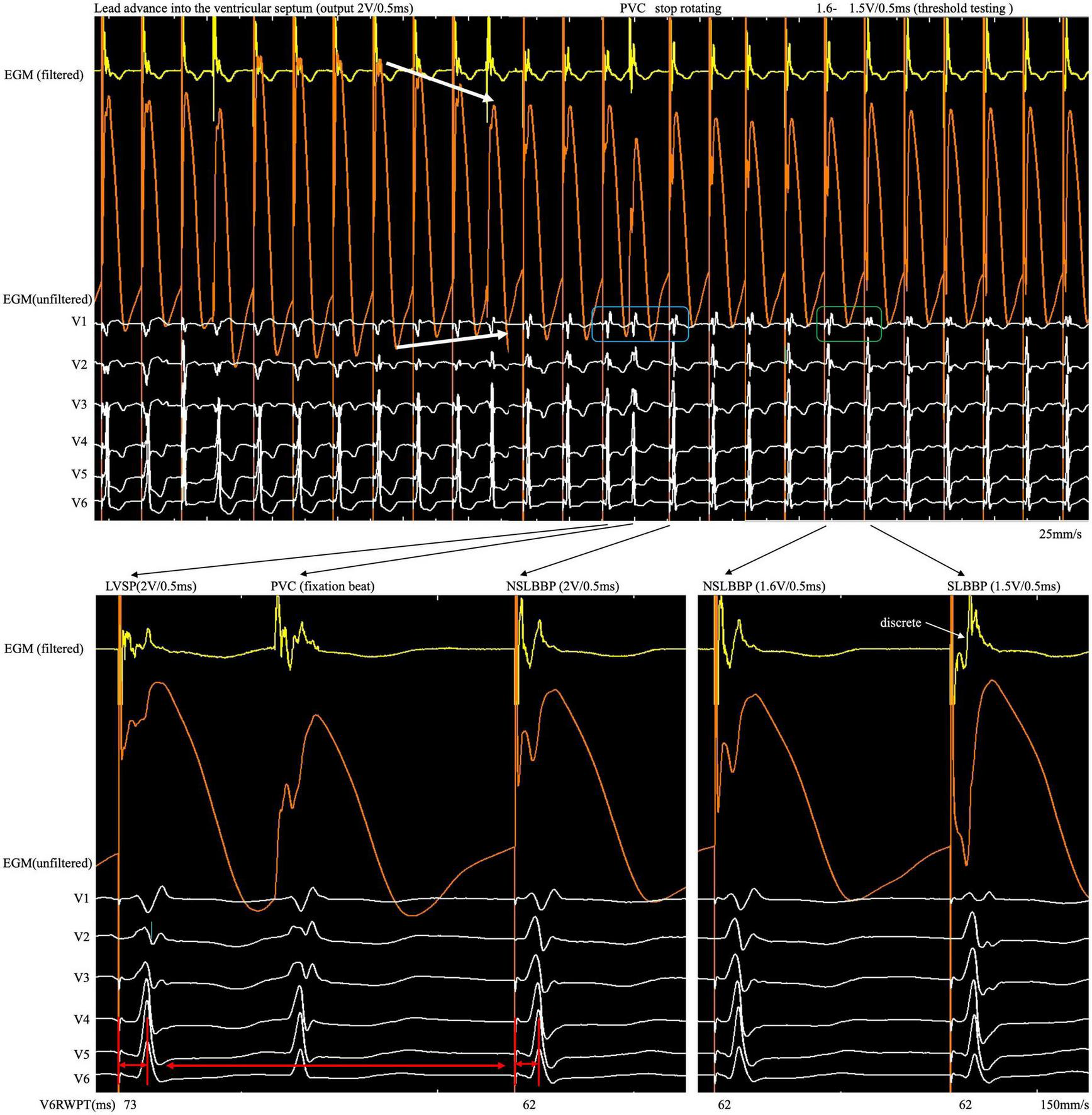 A 76-year-old woman with atrial fibrillation and third-degree atrioventricular block underwent LBBP. Echocardiography examination revealed left ventricular end-diastolic diameter of 44 mm and left ventricular ejection fraction of 75%. Uninterrupted ECG and EGM were recorded on an electrophysiology system using John Jiang’s connecting cable (Xinwell Medical Technology Co., Ltd., Ningbo, Zhejiang, China) (5, 6). In contrast to the interrupted pacing method, this continuous pacing and recording technique enables real-time monitoring of changes in ventricular COI and the paced QRS complex as the lead advances into the interventricular septum. We previously described the LBBP implantation procedure in detail (7, 8). During the entire screw-in process, the COI amplitude increased, peaked, and gradually decreased, followed by a small but significant abrupt decrease (Figure 1). Simultaneously, the impedance dropped from 691 to 532 Ω, and the myocardium capture was lost. This indicates septal perforation. No transition from left ventricular septal pacing to non-selective LBBP (NSLBBP) or NSLBBP to selective LBBP was observed during implantation. With no evidence of LBB capture, the electrode was retracted for the second implant. Repositioning to another site was uneventful. Smooth transition of paced QRS morphology from the LBB block pattern to the right bundle branch block pattern was observed as the lead advanced from the right to left side of the septum. After the COI amplitude peaked, the electrode was rotated very slowly to avoid a sudden drop in COI until the LBB area was reached. An abrupt shortening of the V6 R-wave peak time (V6RWPT) and a discrete EGM were subsequently observed (Figure 2), indicating LBB capture (9). The pacing threshold at the end of procedure was 0.7 V/0.5 ms. The lead was placed at a depth of 14 mm (Supplementary Figure).