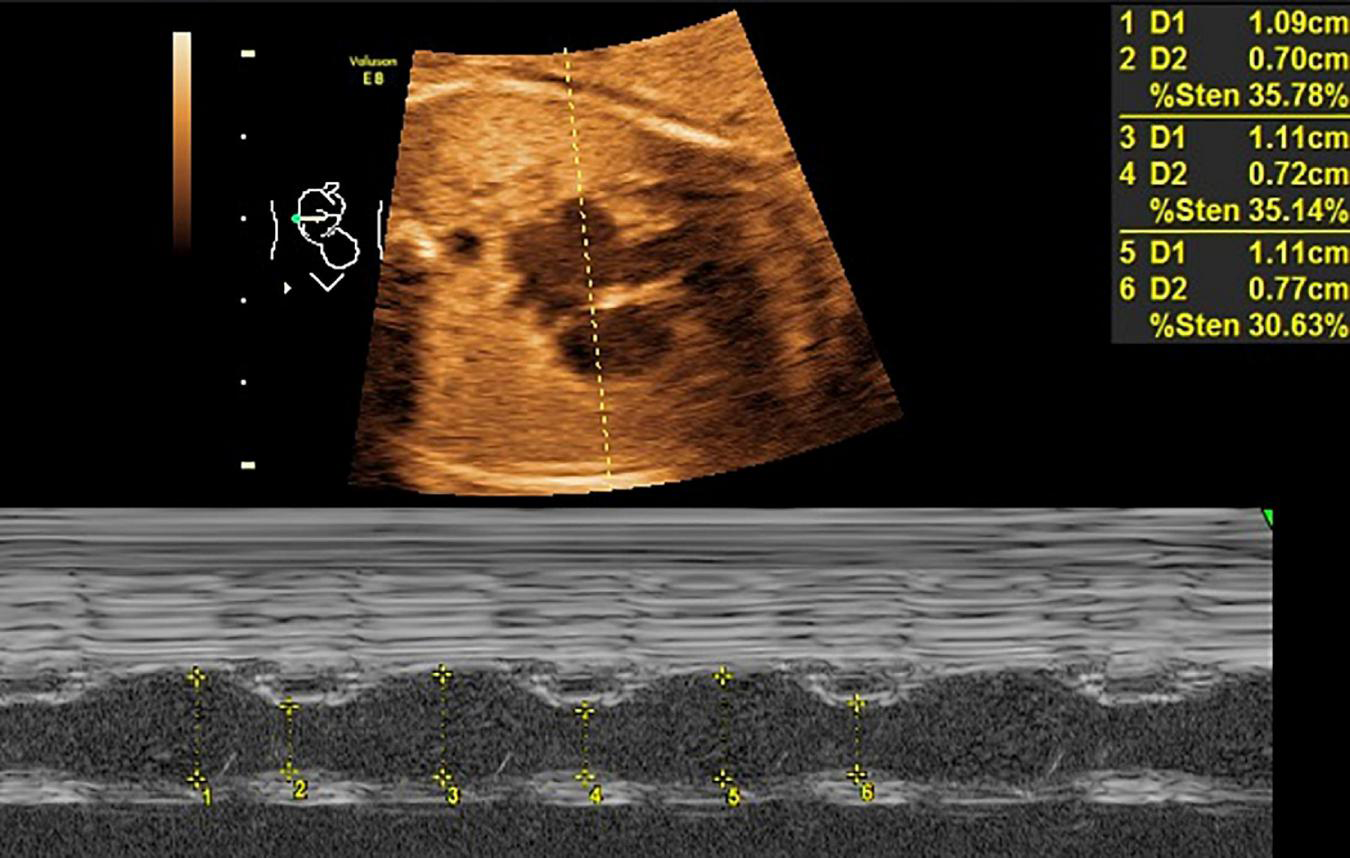 GE Voluson 8 ultrasound device equipped with RAB4-8-D probe (4–8 HMz) was used.