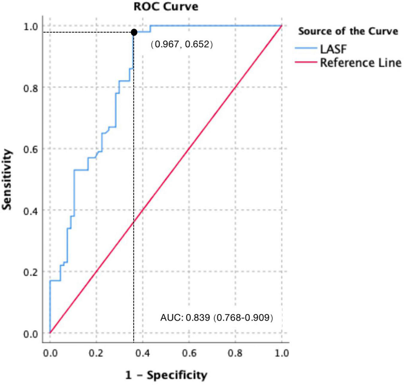 Receiver operating characteristic (ROC) curve of LASF to predict GDM fetal septal hypertrophy.