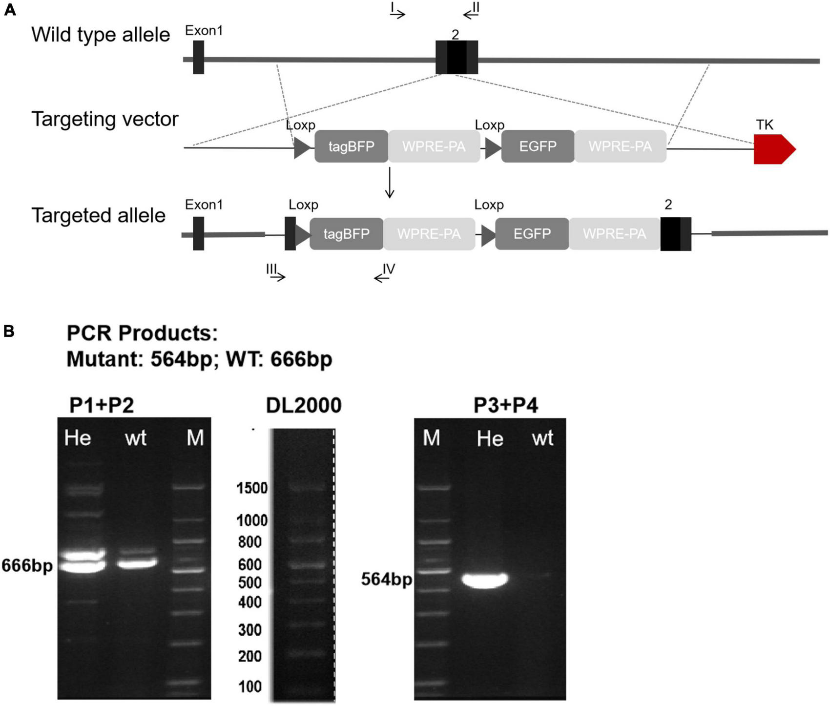 Figure 2. Generation of Cx43-BFP-GFP/ + reporter line. (A) Schematic diagram showing the targeting strategy of Cx43-BFP-GFP allele by homologous recombination using CRISPR/Cas9; (B) polymerase chain reaction (PCR) of genomic DNA, P1 + P2 means primer1 + primer2; P3 + P4 means primer3 + primer4; Heterozygous amplified a 564 bp band.