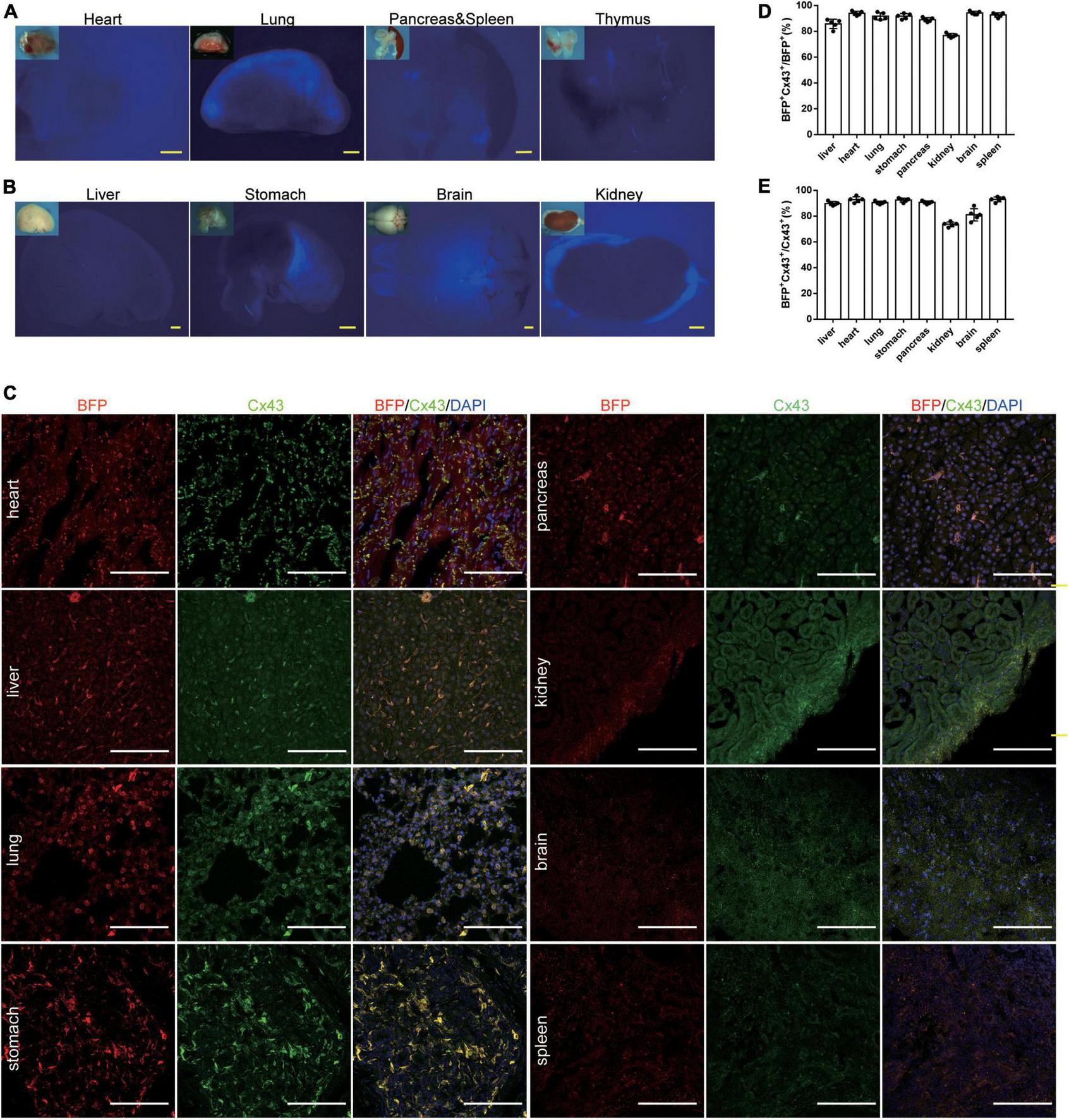 Figure 3. Generation and Characterization of Cx43-BFP-GFP/ + reporter line. (A,B) Whole-mount bright field and epifluorescence images of visceral organs from 6-weeks Cx43-BFP-GFP/ + mice; (C) immunostaining for BFP and Cx43 on heart, lung, brain, stomach, kidney, liver, spleen, and pancreas sections. The high magnification images of organs in areas labeled with the square dotted frame, respectively; (D) quantification of the labeling efficiency by the percentage of BFP+ Cx43+ in BFP+ cells. Data are the mean ± SD; n = 5 mice per group; (E) quantification of the labeling specificity by the percentage of BFP+ Cx43+ in Cx43+ cells. Data are the mean ± SD; n = 5 images per group. Yellow scale bar = 1 mm, white scale bar = 100 μm.
