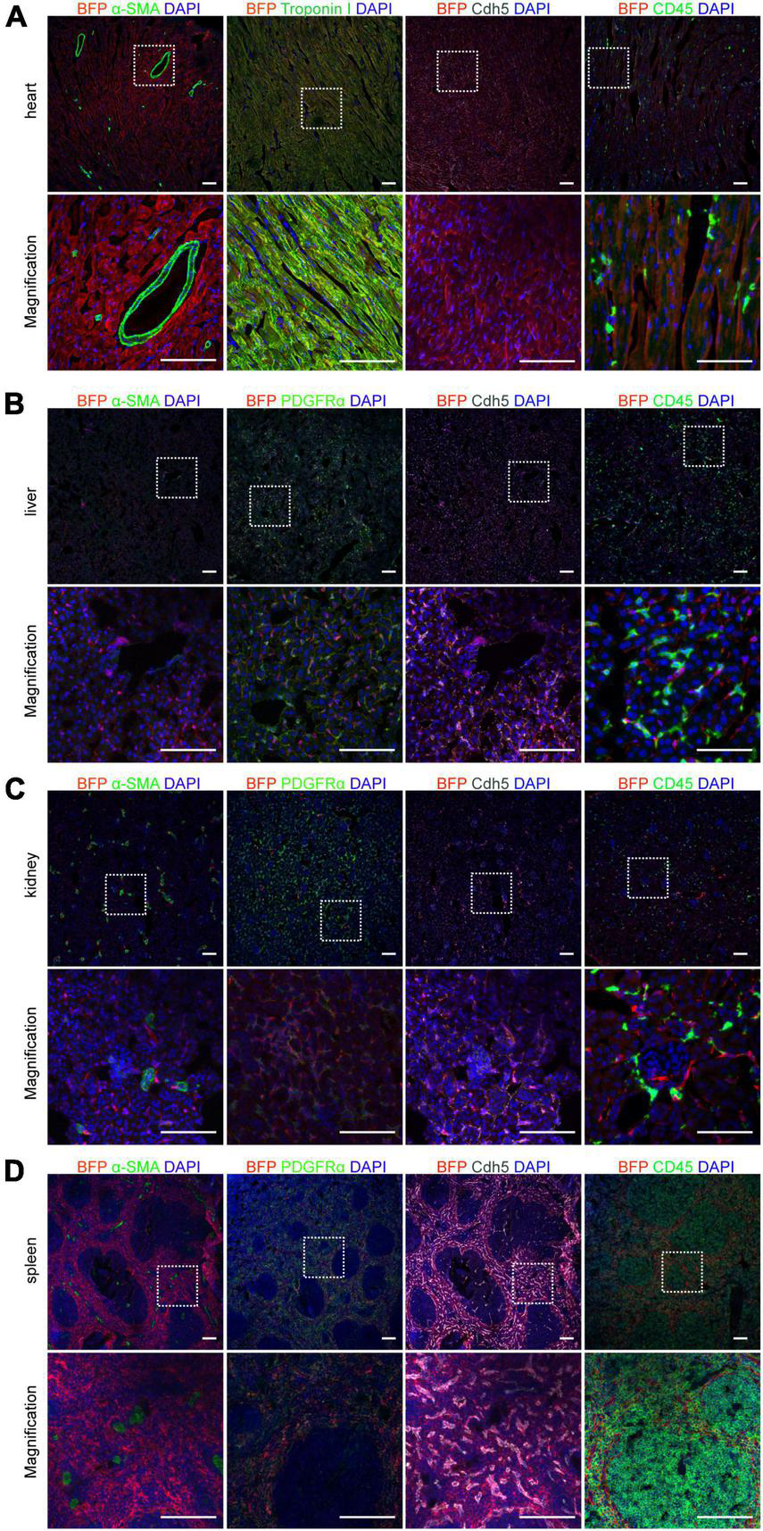 Figure 5. Expression of Cx43 in different cells on 6-week Cx43-BFP-GFP/ + mice. (A) Immunostaining for BFP, Cdh5, CD45, α-SMA, and Troponin I on heart sections; (B–D) immunostaining for BFP, α-SMA, PDGFRα, Cdh5, and CD45 on liver, kidney and spleen sections. The high magnification images of organs in areas labeled with the square dotted frame. Scale bar = 100 μm.